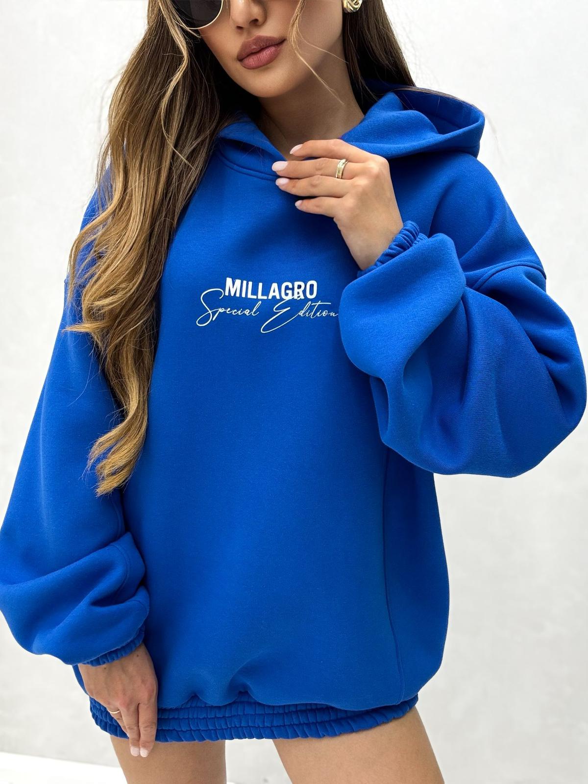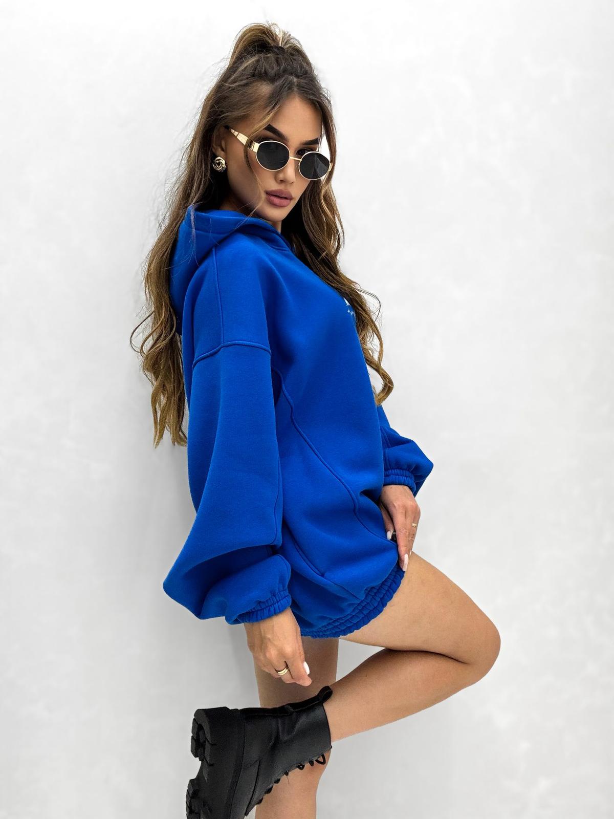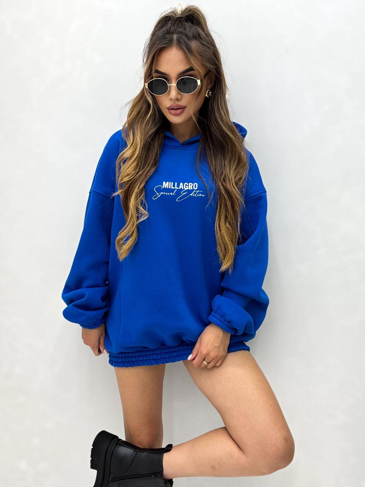 Bluza o luźnym kroju z kapturem oraz ściągaczem w pasie. Wykonana z wysokiej jakości tkaniny De Lux. Polska produkcja.