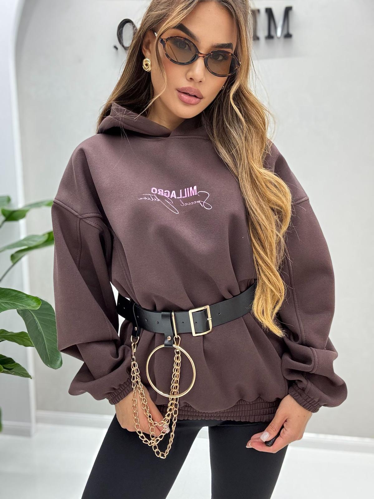 Bluza o luźnym kroju z kapturem oraz ściągaczem w pasie. Wykonana z wysokiej jakości tkaniny De Lux. Polska produkcja.