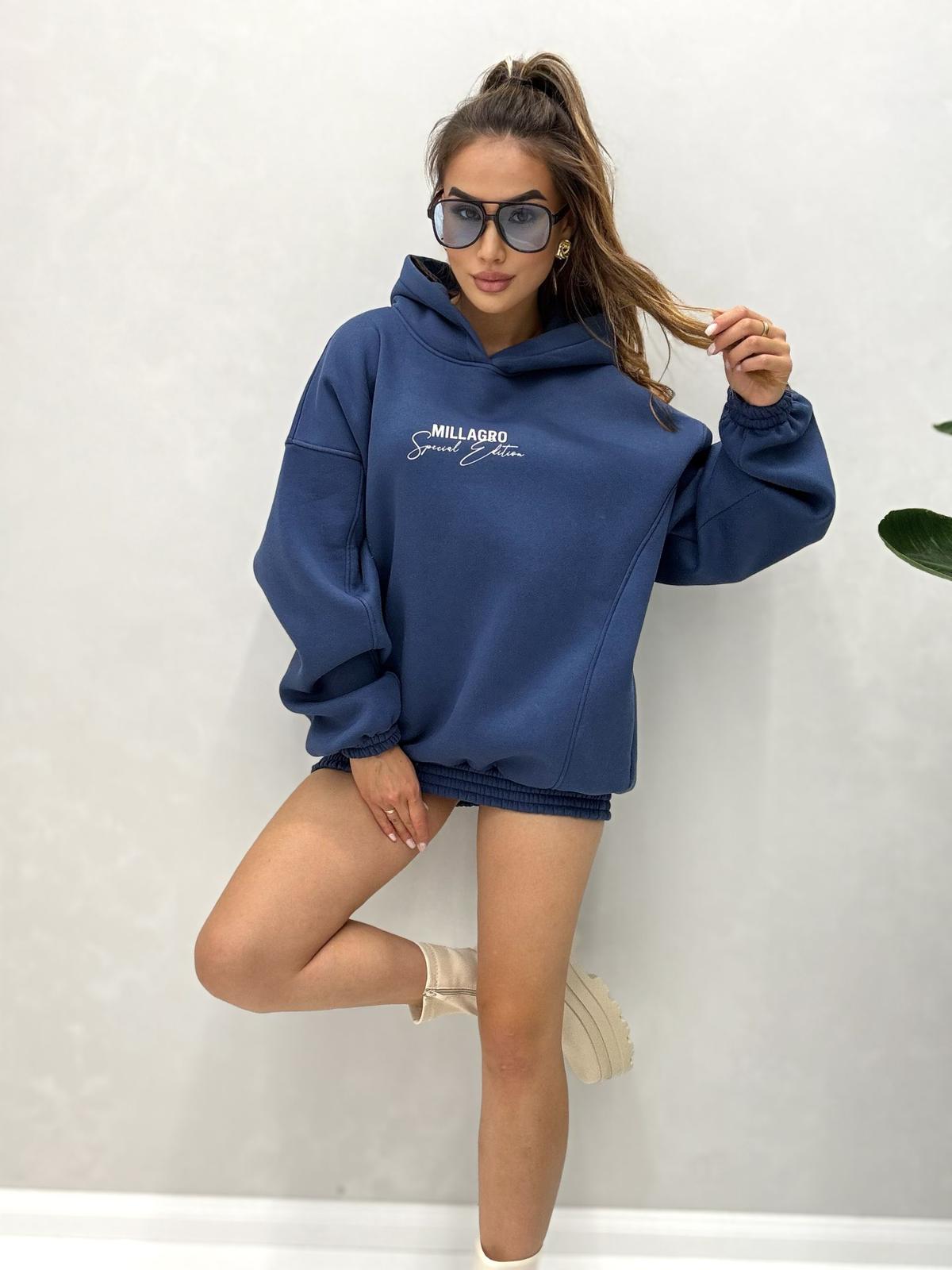 Bluza o luźnym kroju z kapturem oraz ściągaczem w pasie. Wykonana z wysokiej jakości tkaniny De Lux. Polska produkcja.