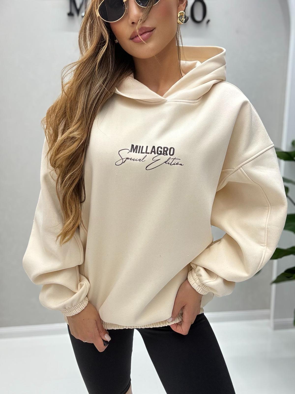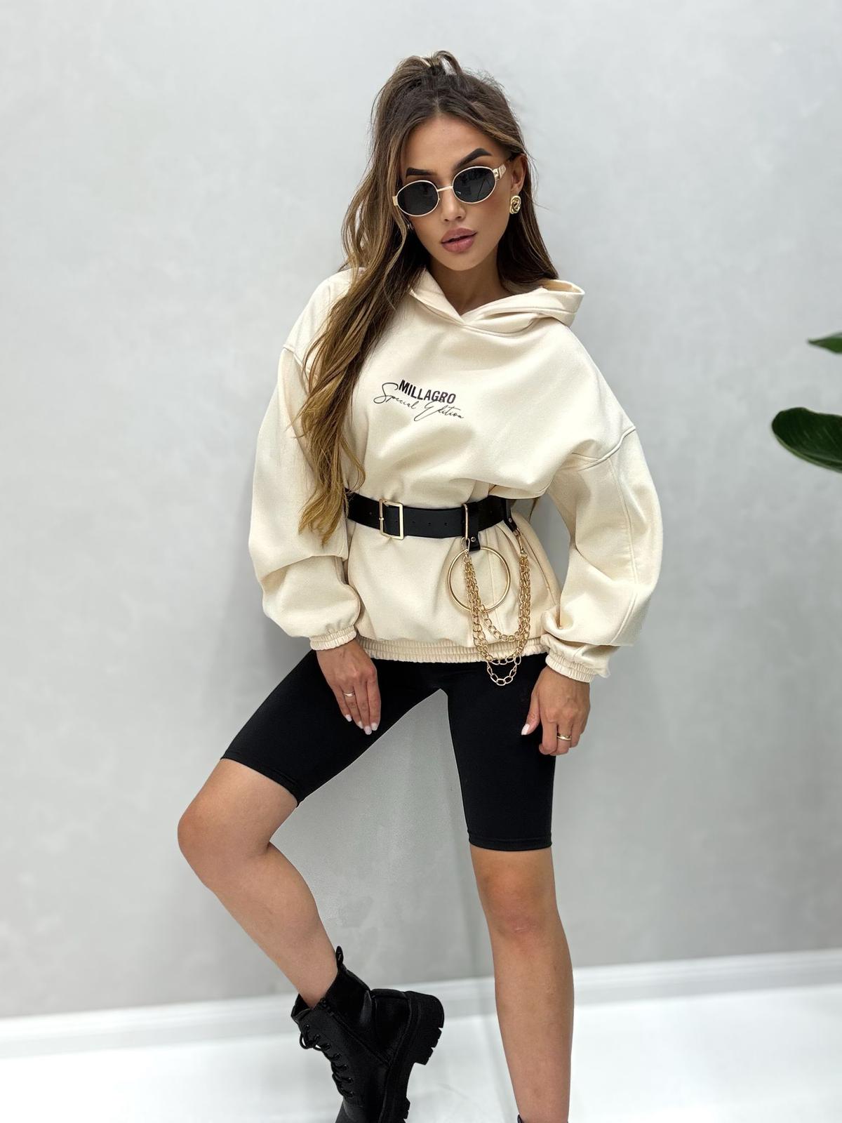 Bluza o luźnym kroju z kapturem oraz ściągaczem w pasie. Wykonana z wysokiej jakości tkaniny De Lux. Polska produkcja.