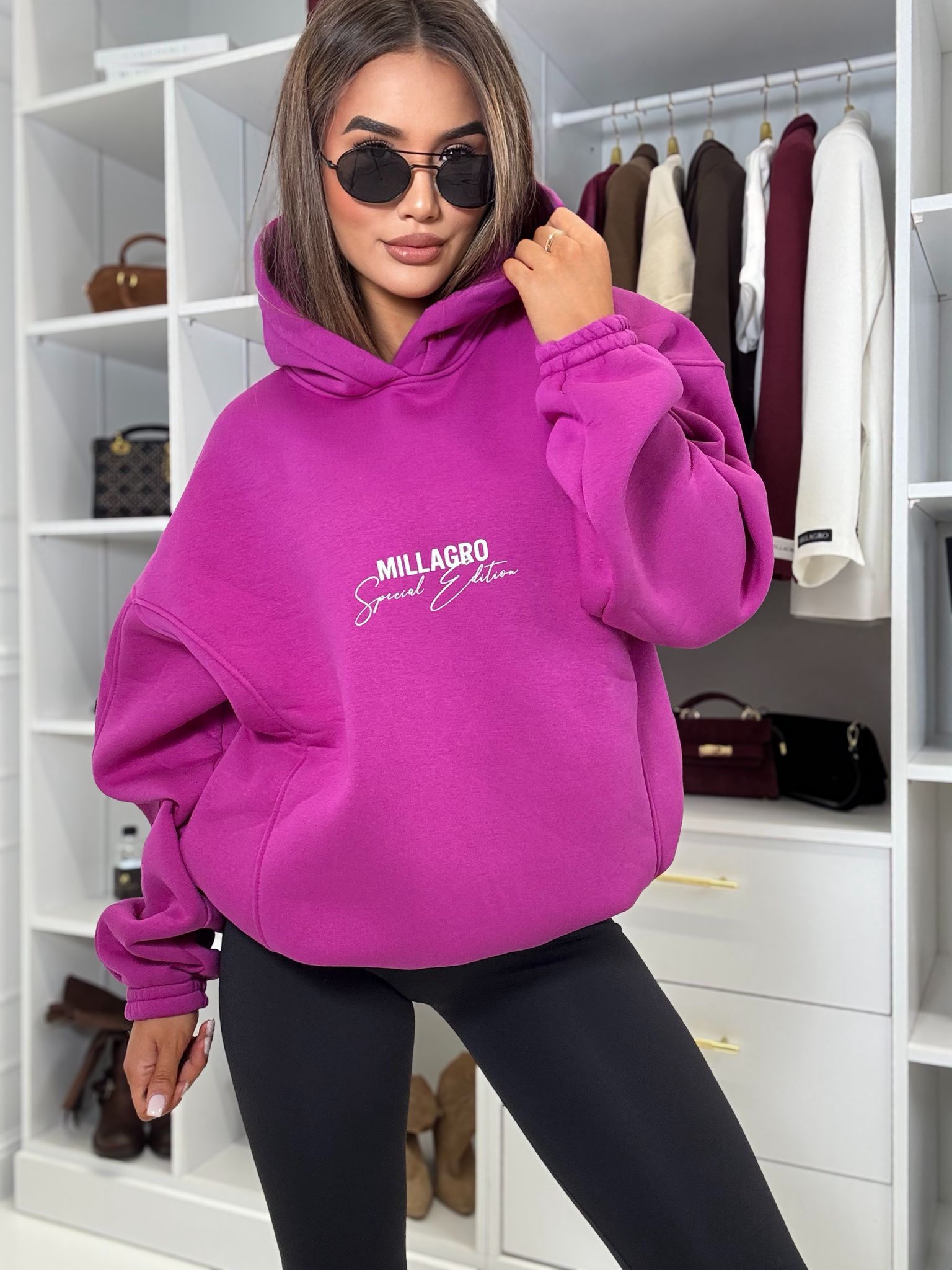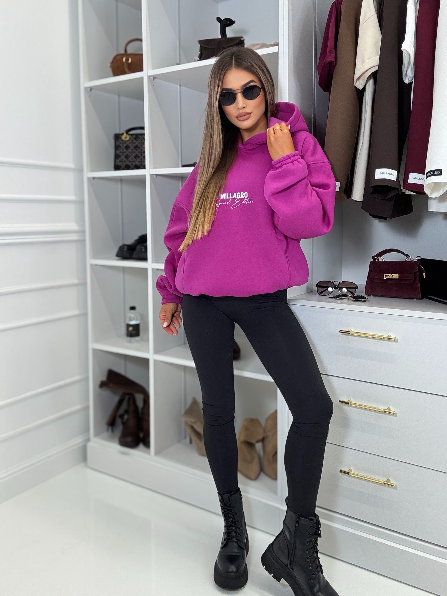 Bluza o luźnym kroju z kapturem oraz ściągaczem w pasie. Wykonana z wysokiej jakości tkaniny De Lux. Polska produkcja.