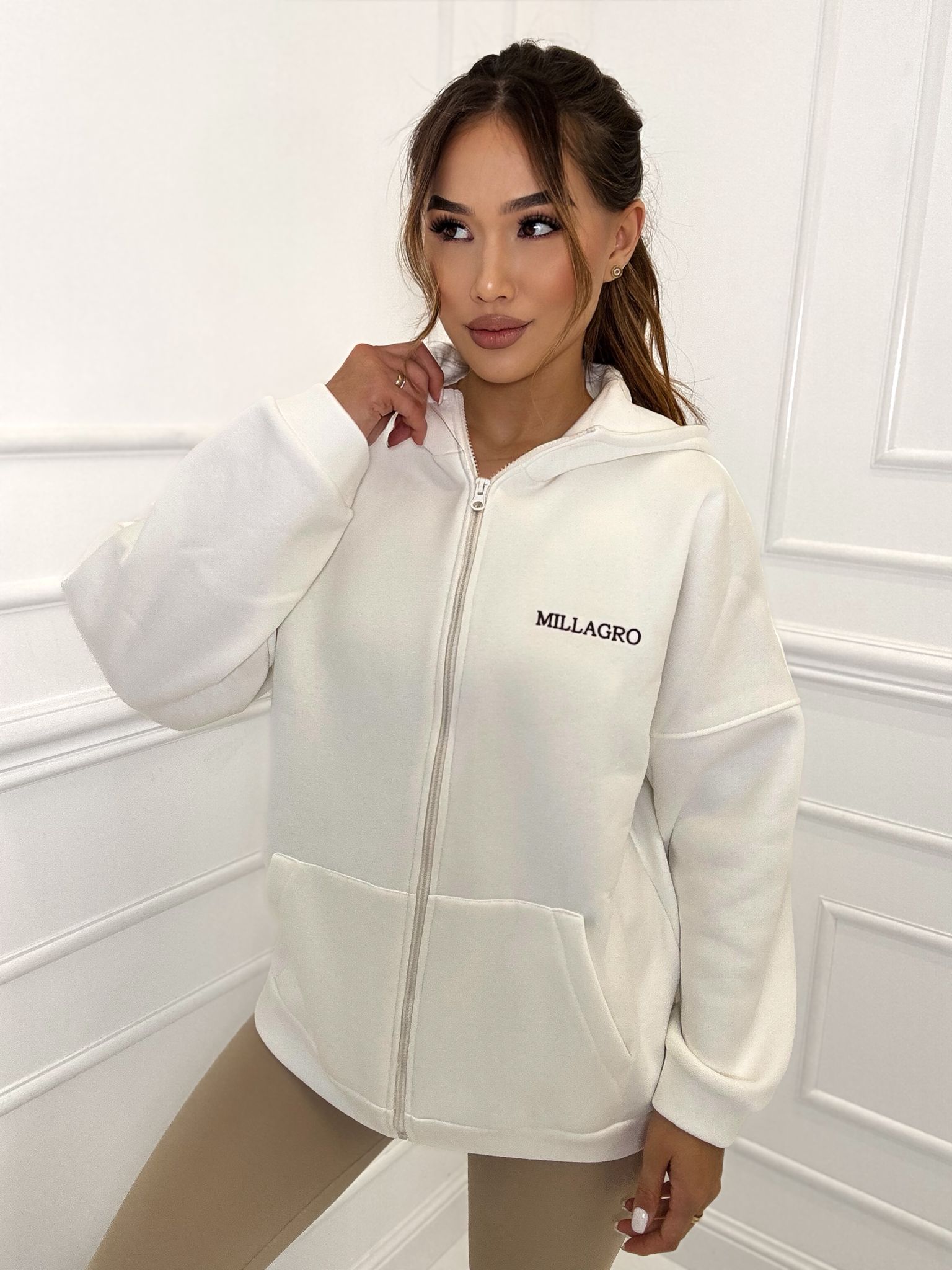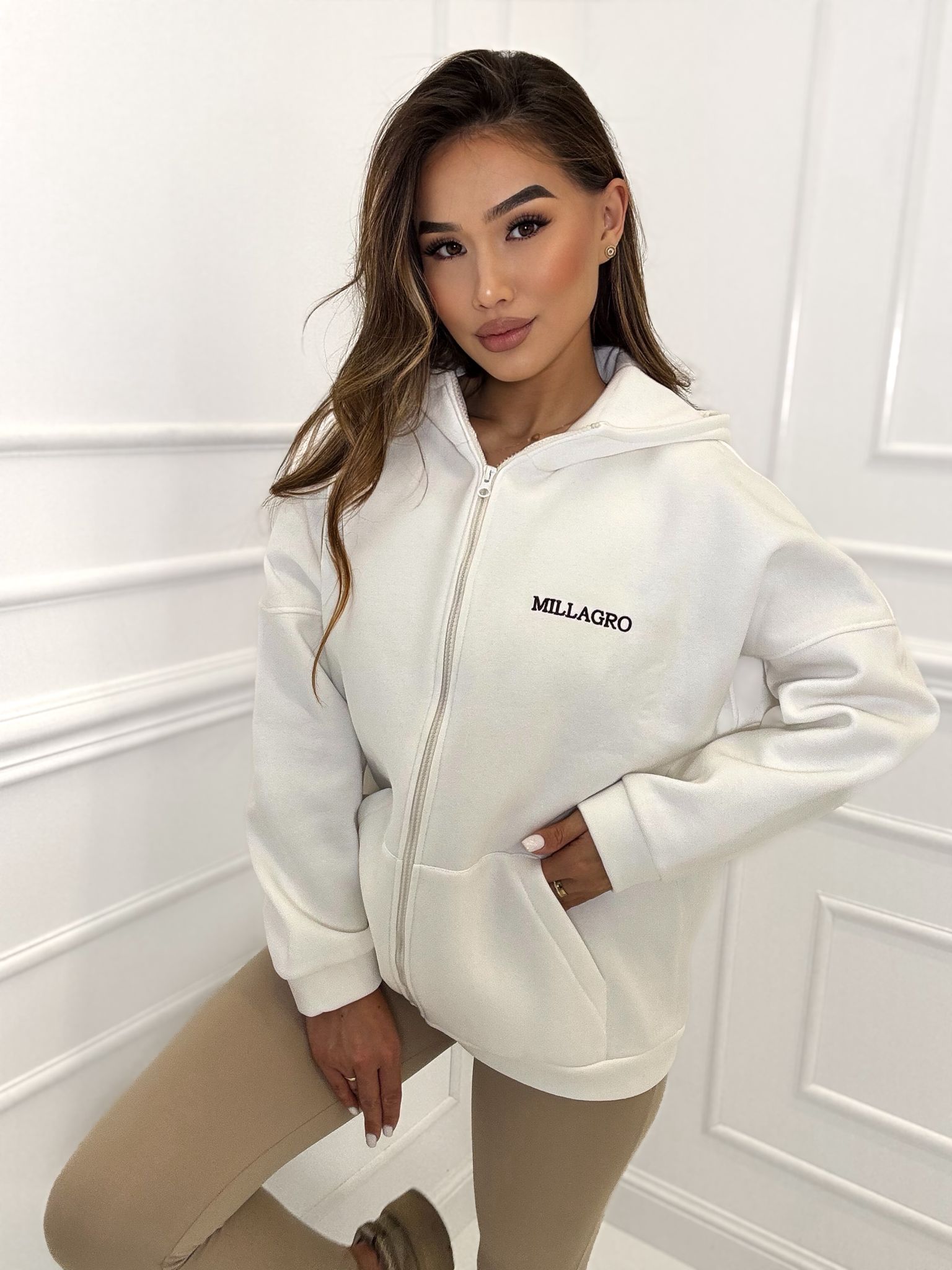 Bluza rozpinana Milla long o luźnym kroju z kapturem, ocieplana. Bluza wykonana z wysokiej jakości tkaniny De Lux bardzo przyjemnej i delikatnej w dotyku. Polska produkcja.