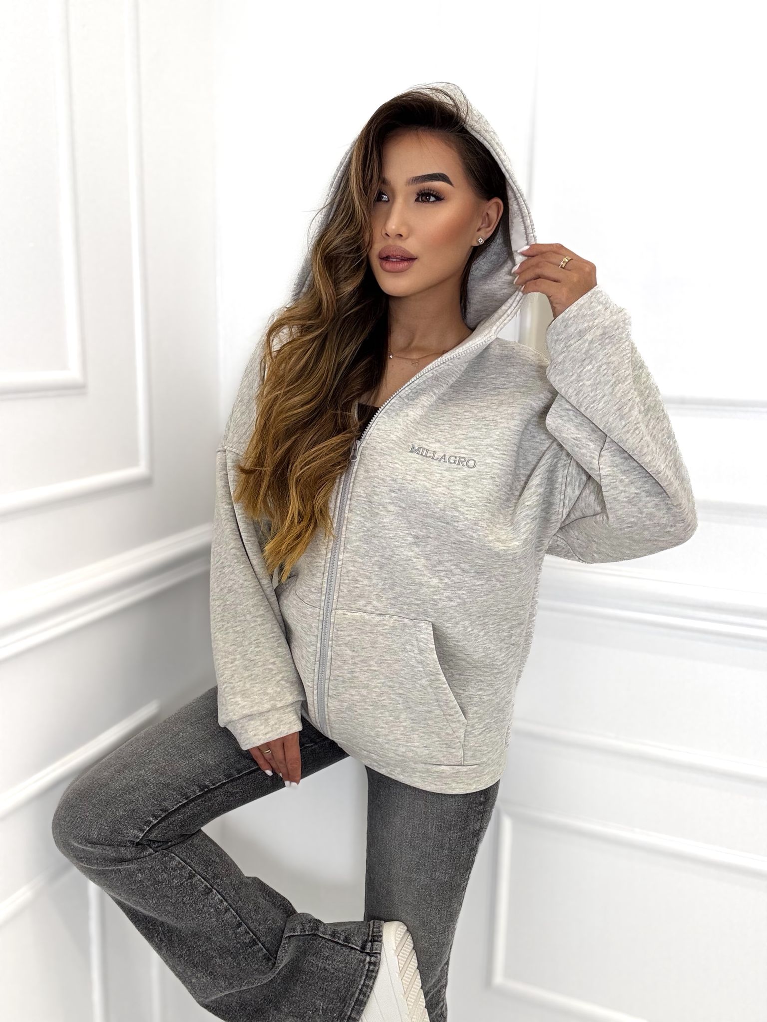 Bluza rozpinana Milla long o luźnym kroju z kapturem, ocieplana. Bluza wykonana z wysokiej jakości tkaniny De Lux bardzo przyjemnej i delikatnej w dotyku. Polska produkcja.