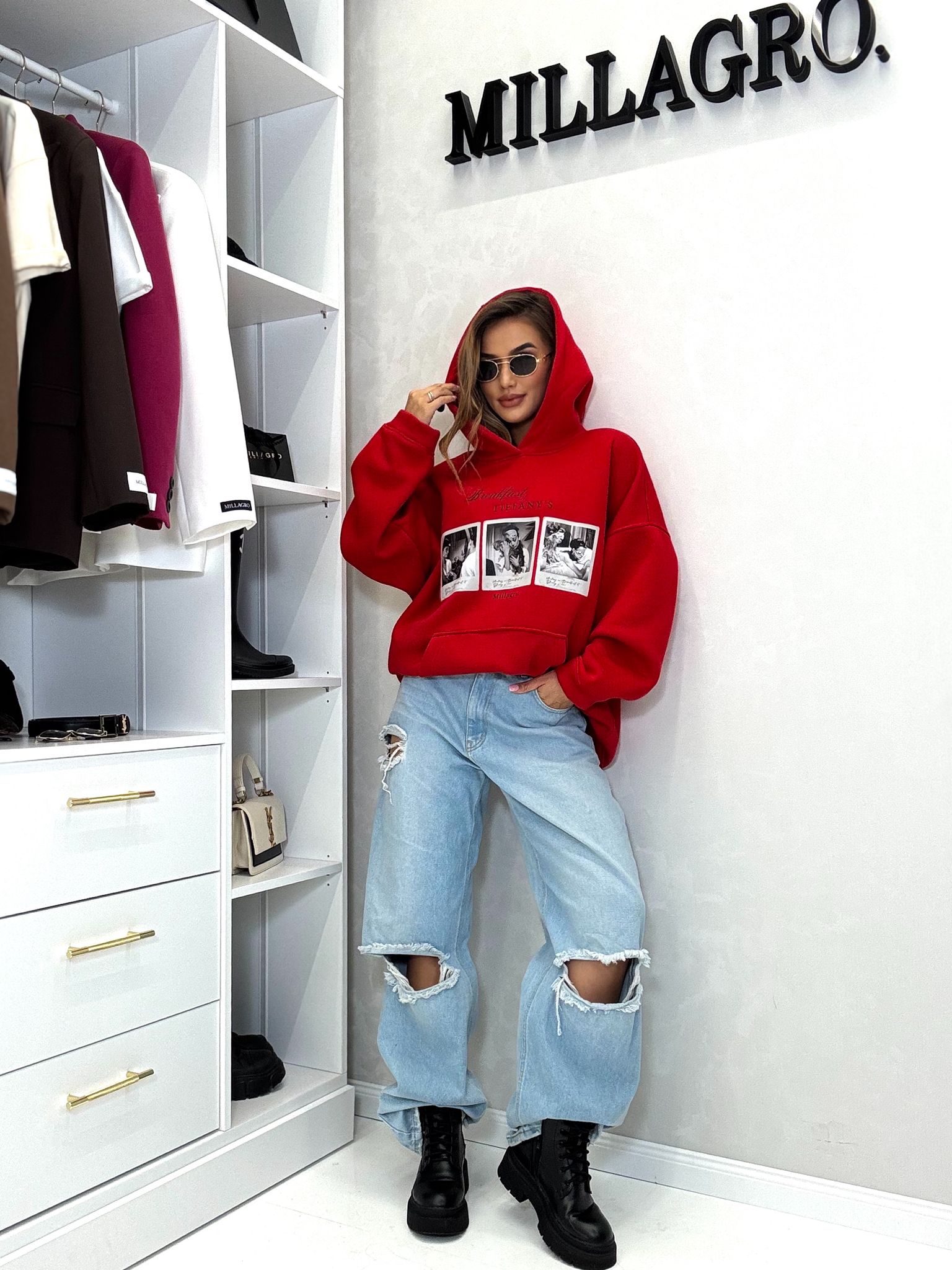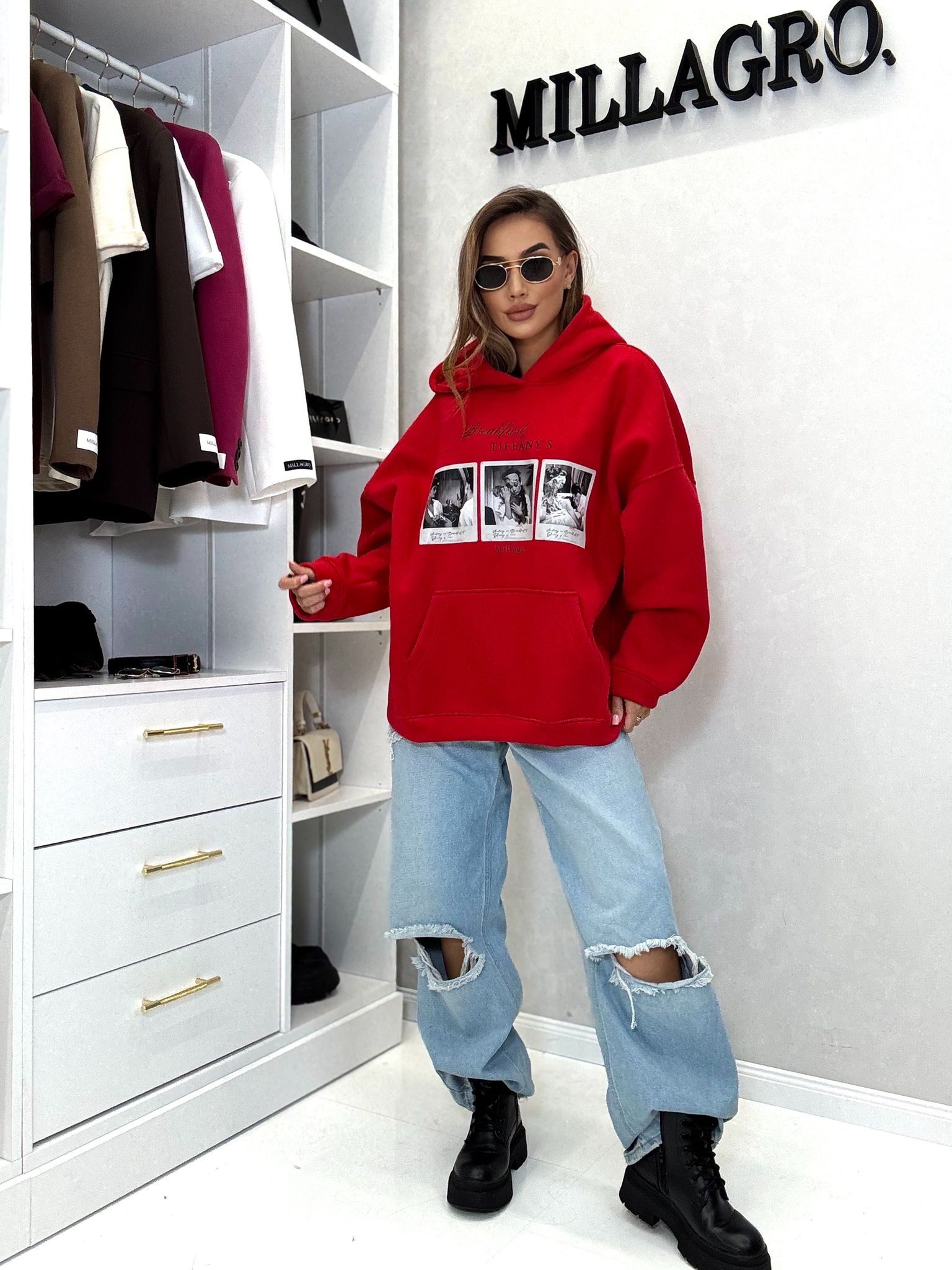Bluza Tiffany o luźnym kroju z kapturem oraz kieszenią, delikatnie ocieplana. Bluza wykonana z wysokiej jakości tkaniny De Lux bardzo przyjemnej i delikatnej w dotyku. Polska produkcja.