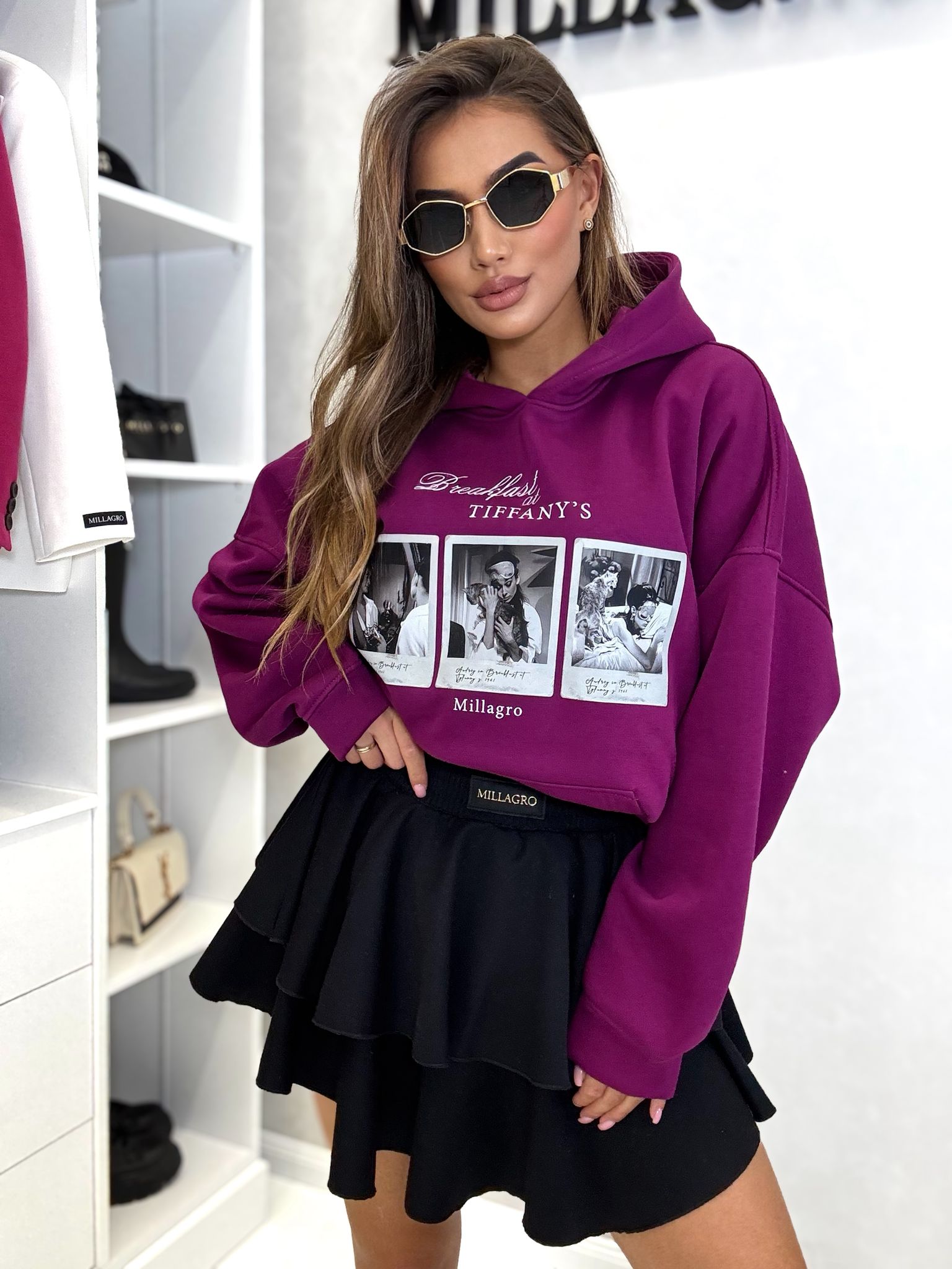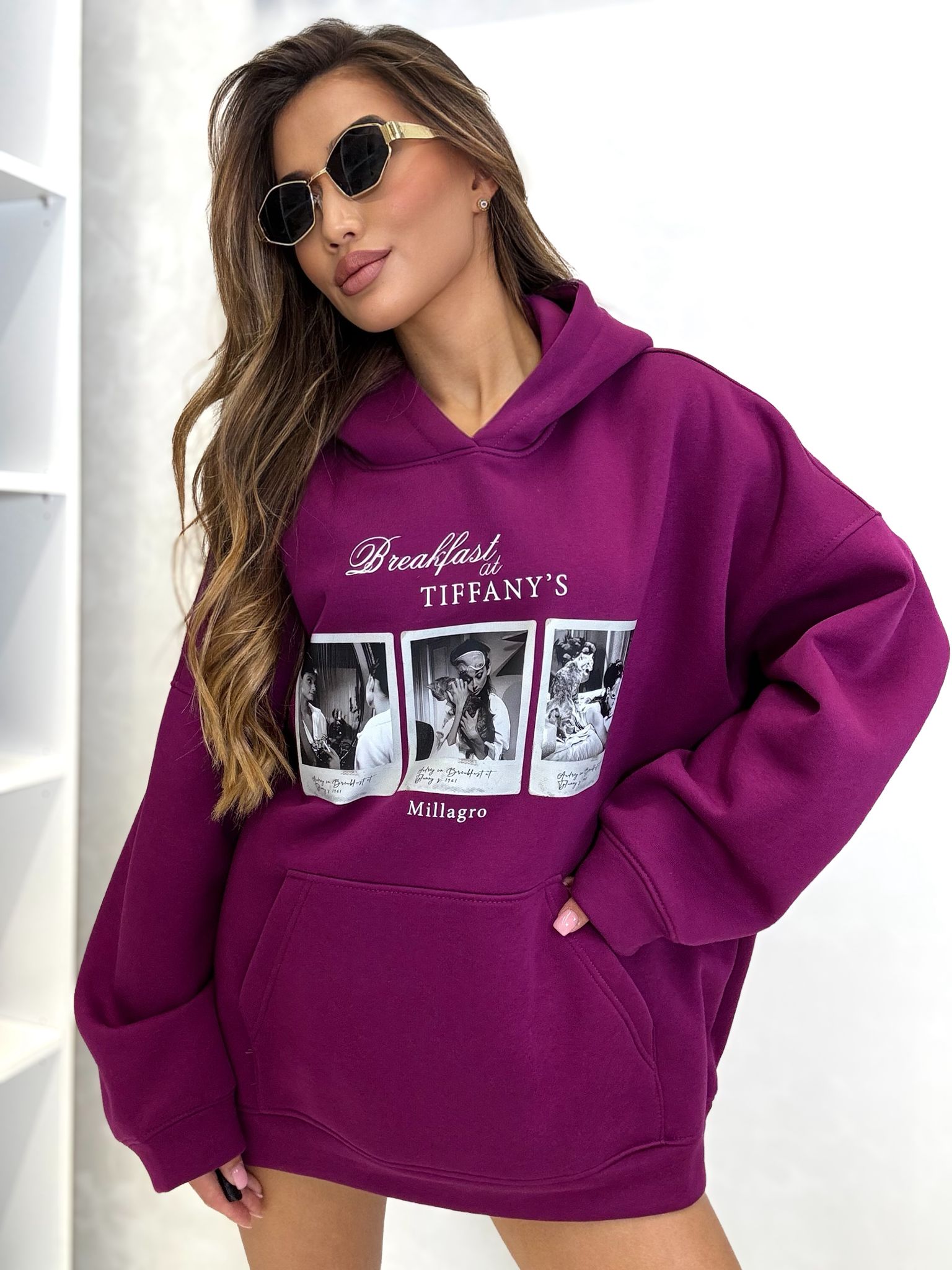 Bluza Tiffany o luźnym kroju z kapturem oraz kieszenią, delikatnie ocieplana. Bluza wykonana z wysokiej jakości tkaniny De Lux bardzo przyjemnej i delikatnej w dotyku. Polska produkcja.