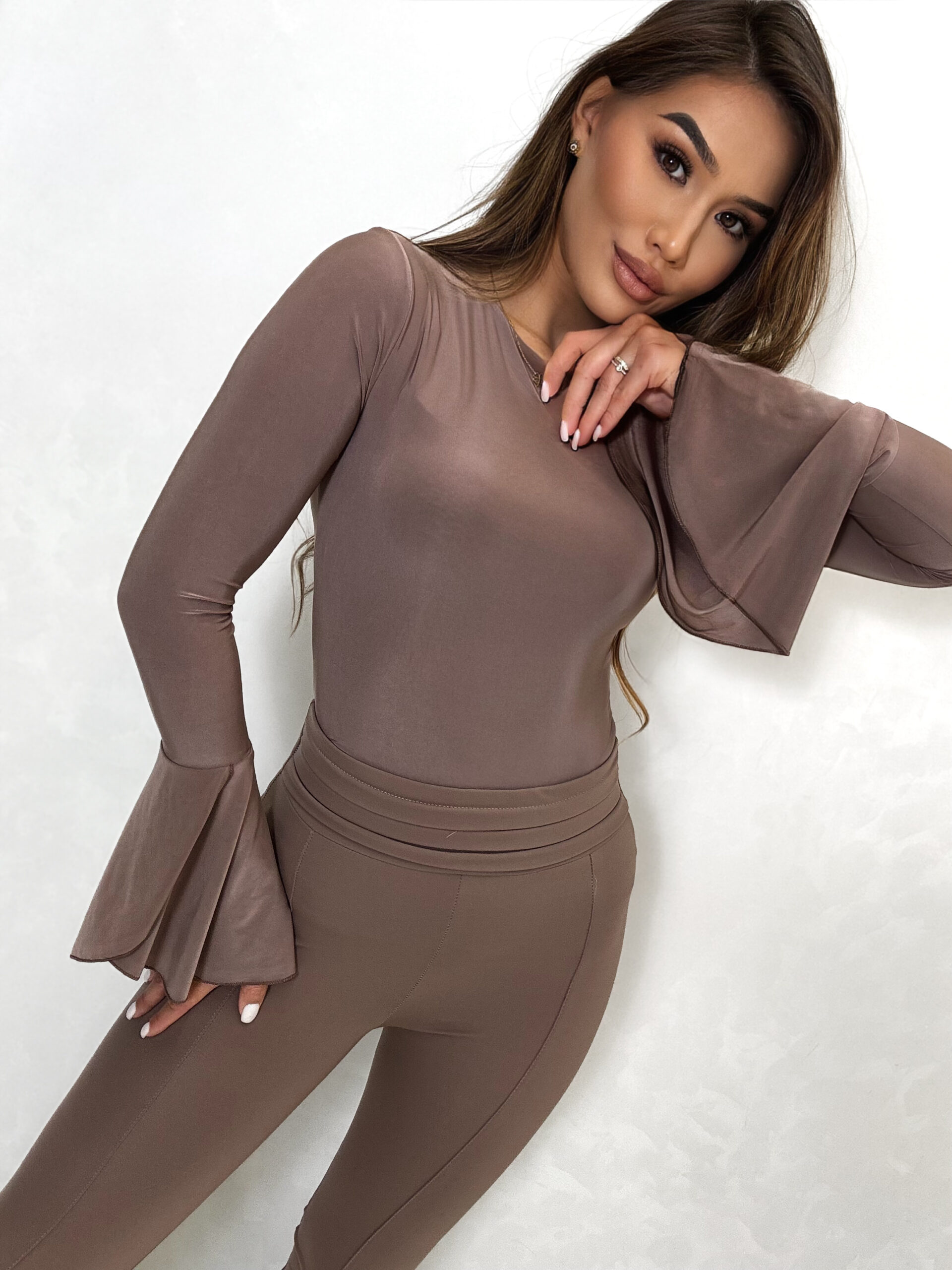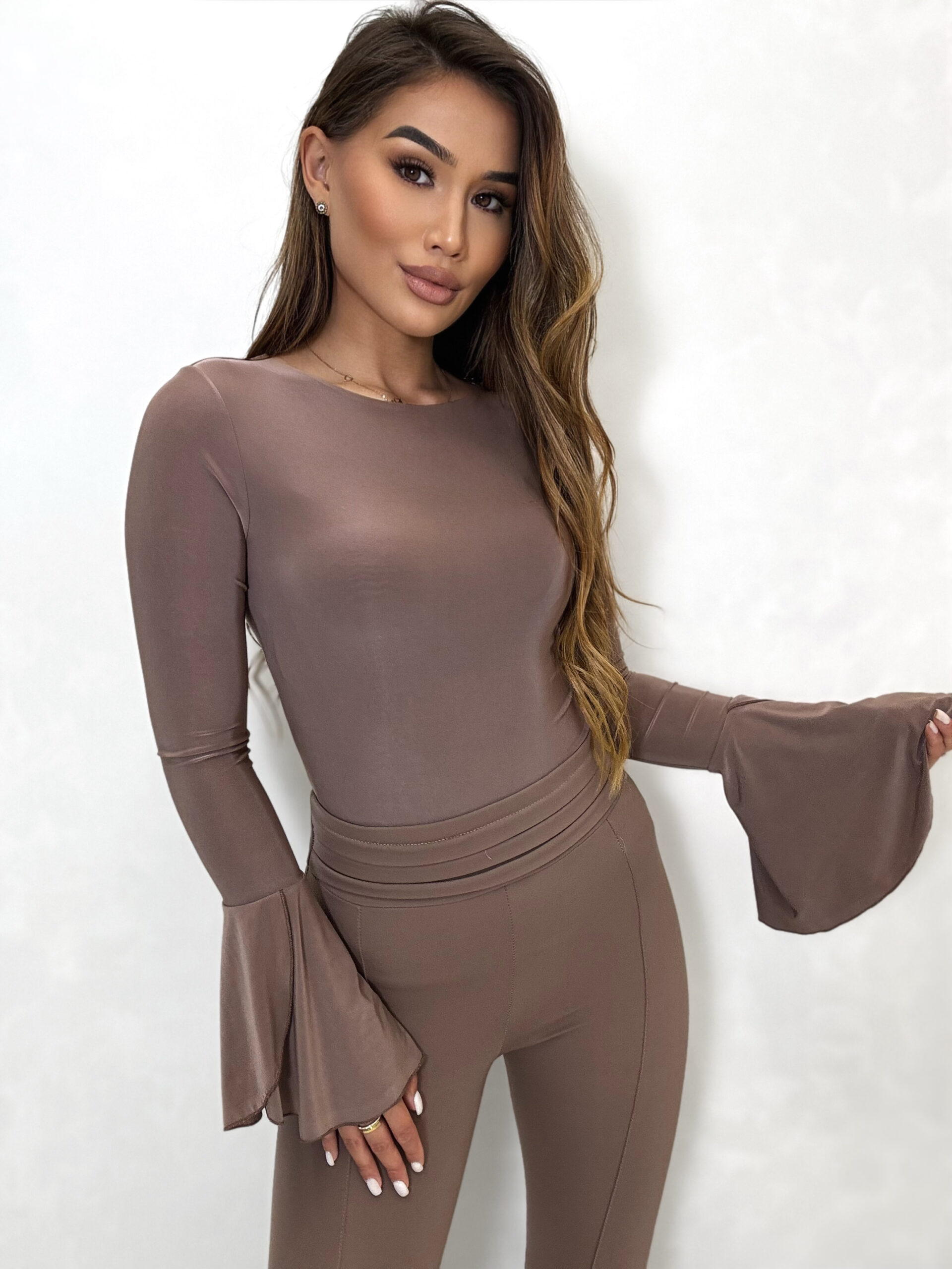 Gładka bluzka z rękawkiem zakończonym delikatną falbanką w przepięknych jesiennych kolorach, bluzka wykonana z wysokiej jakości tkaniny De Lux przyjemnej w dotyku. Polska produkcja.