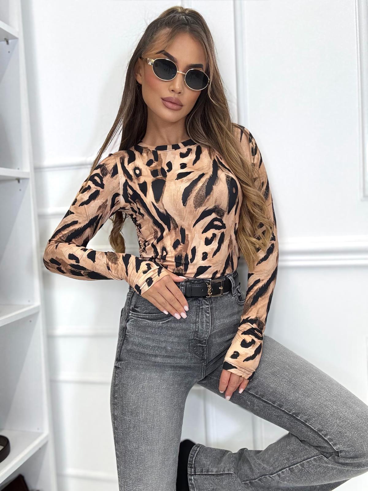 Bluzka na paluszek i marszczeniami w przepięknych printach kwiatowych i zwierzęcych, bluzka wykonana z wysokiej jakości tkaniny De Lux przyjemnej w dotyku. Polska produkcja.