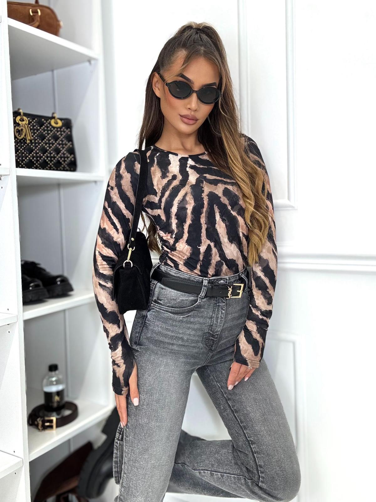 Bluzka na paluszek i marszczeniami w przepięknych printach kwiatowych i zwierzęcych, bluzka wykonana z wysokiej jakości tkaniny De Lux przyjemnej w dotyku. Polska produkcja.