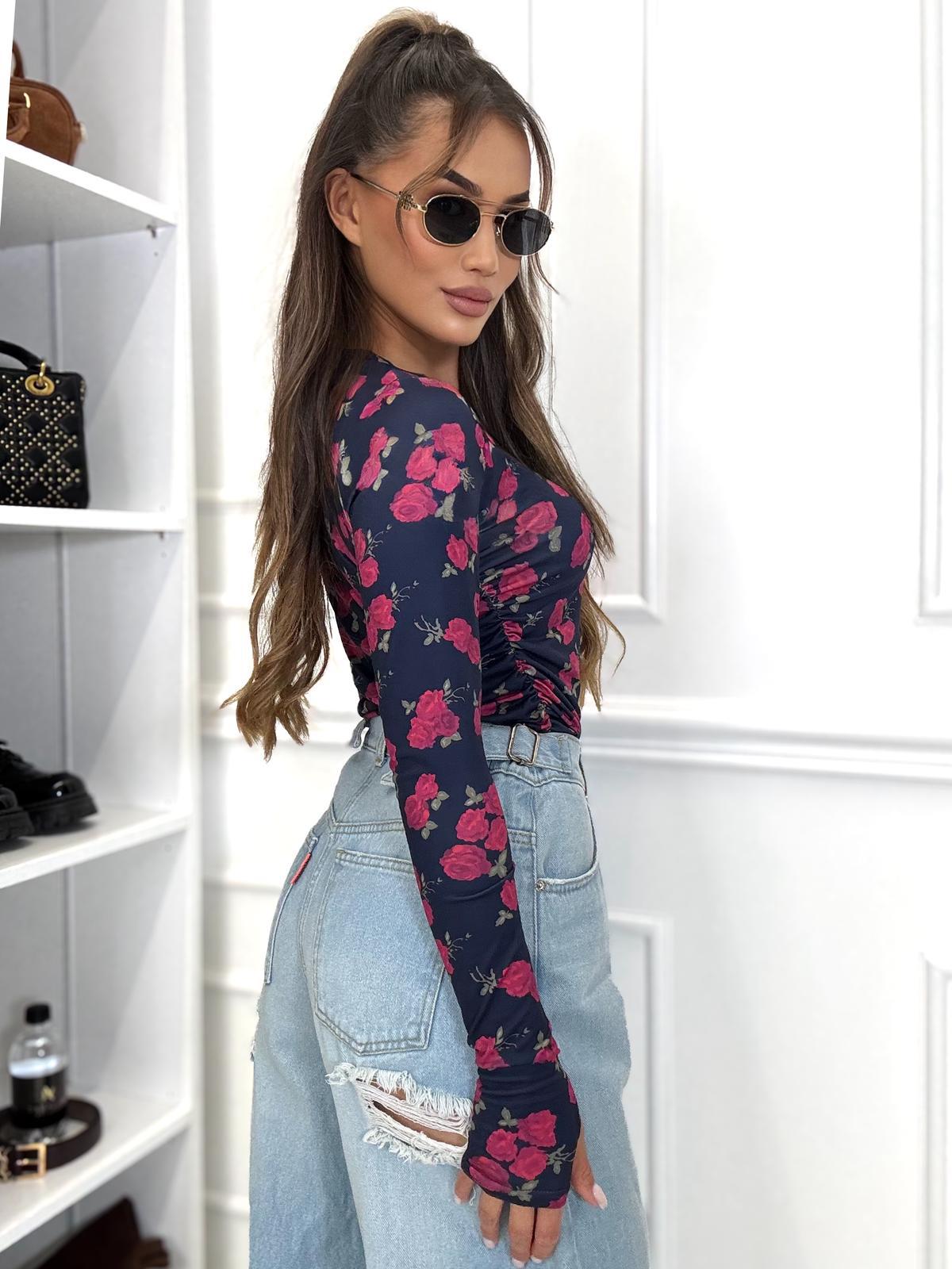 Bluzka na paluszek i marszczeniami w przepięknych printach kwiatowych i zwierzęcych, bluzka wykonana z wysokiej jakości tkaniny De Lux przyjemnej w dotyku. Polska produkcja.