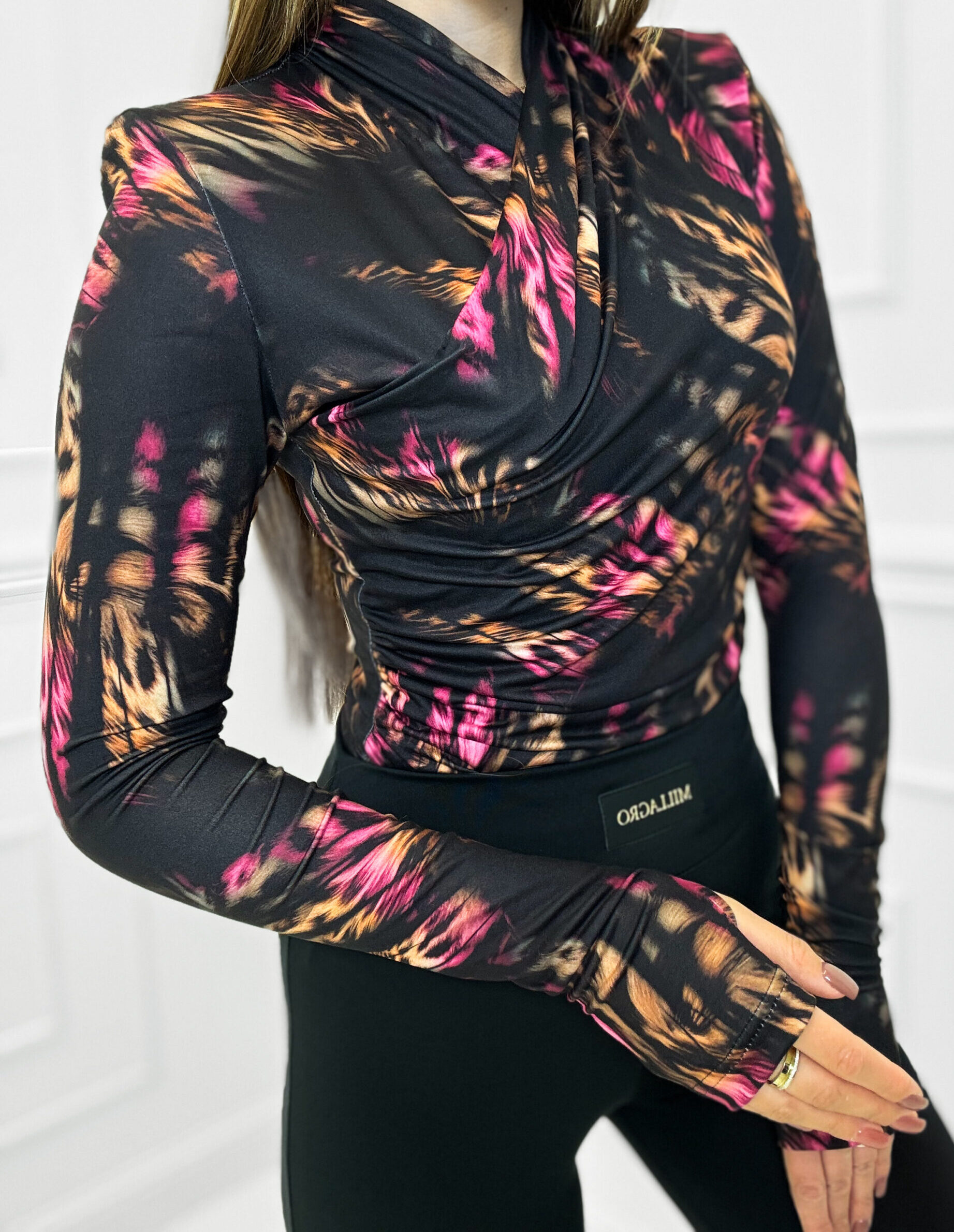 Podkreśl swój wyjątkowy styl z naszą bluzką, która łączy w sobie zmysłowość i nowoczesną elegancję. Wykonana z elastycznego, dopasowującego się do sylwetki materiału, gwarantuje komfort noszenia. Polska produkcja.