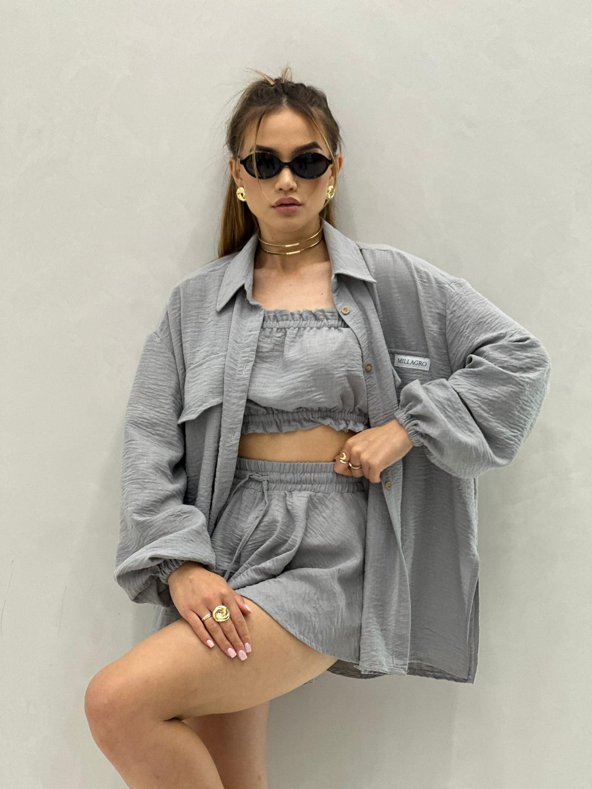 Komplet 3 – częściowy składający się ze spodenek, topu opaski oraz zwiewnej koszuli. Dostępny w przepięknych kolorach, komplet wykonany z wysokiej jakości tkaniny De Lux. Polska produkcja.