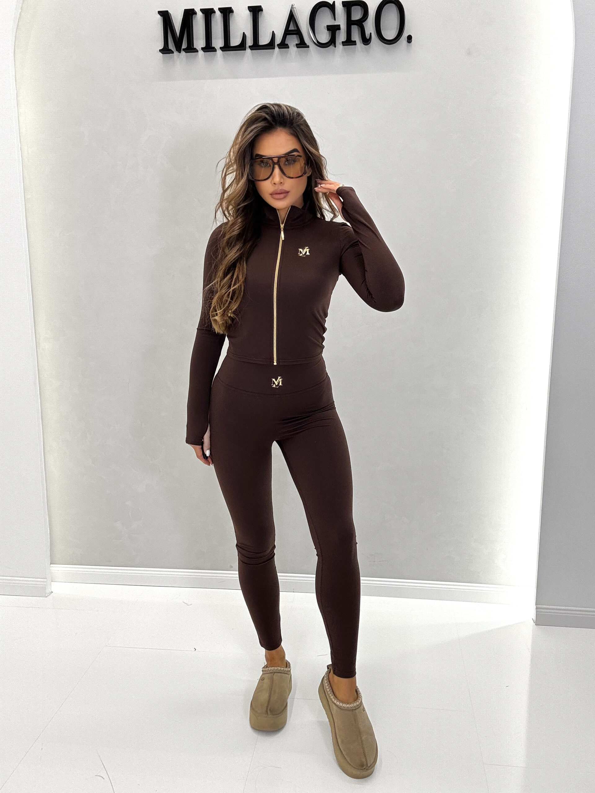 Podkreśl swój styl! Komplet, który łączy wygodę z luksusowym wykończeniem. Zestaw składa się z dopasowanej, elastycznej bluzki zapinanej na złoty zamek oraz legginsów o wysokim stanie, ozdobionym subtelnym, złotym detalem. Przyjemny w dotyku materiał zapewnia komfort przez cały dzień. Polski produkt.