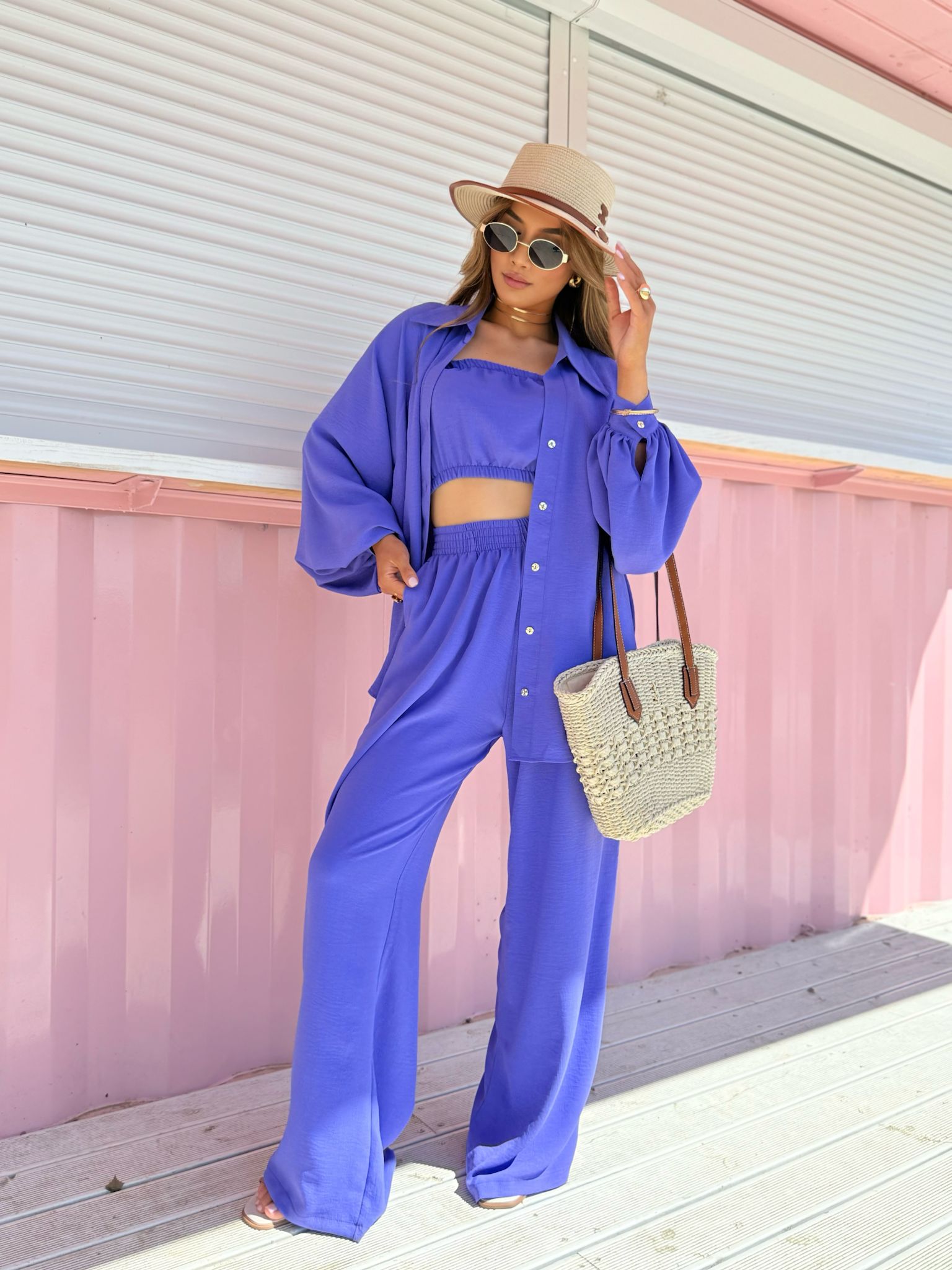 Delikatny, zwiewny komplet 3-częściowy(top, koszula i spodnie). Luźny krój. Polska produkcja.