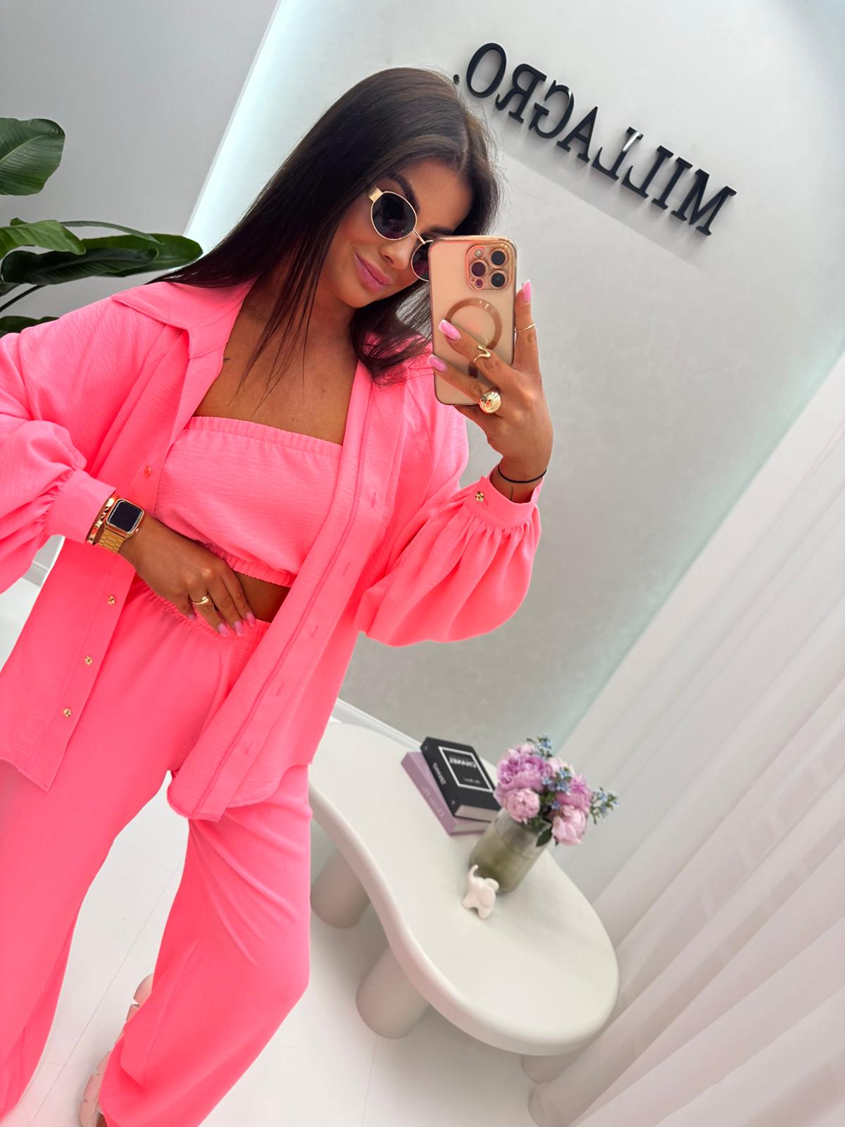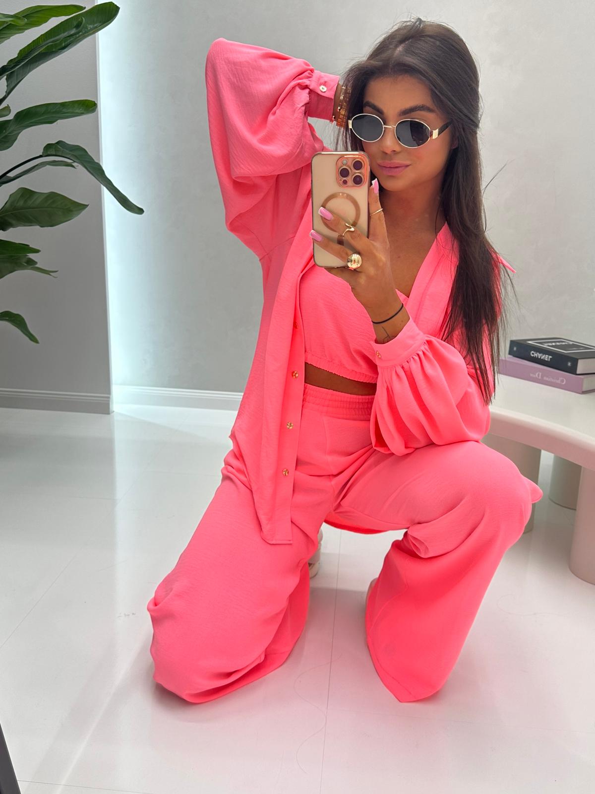 Delikatny, zwiewny komplet 3-częściowy(top, koszula i spodnie). Luźny krój. Polska produkcja.