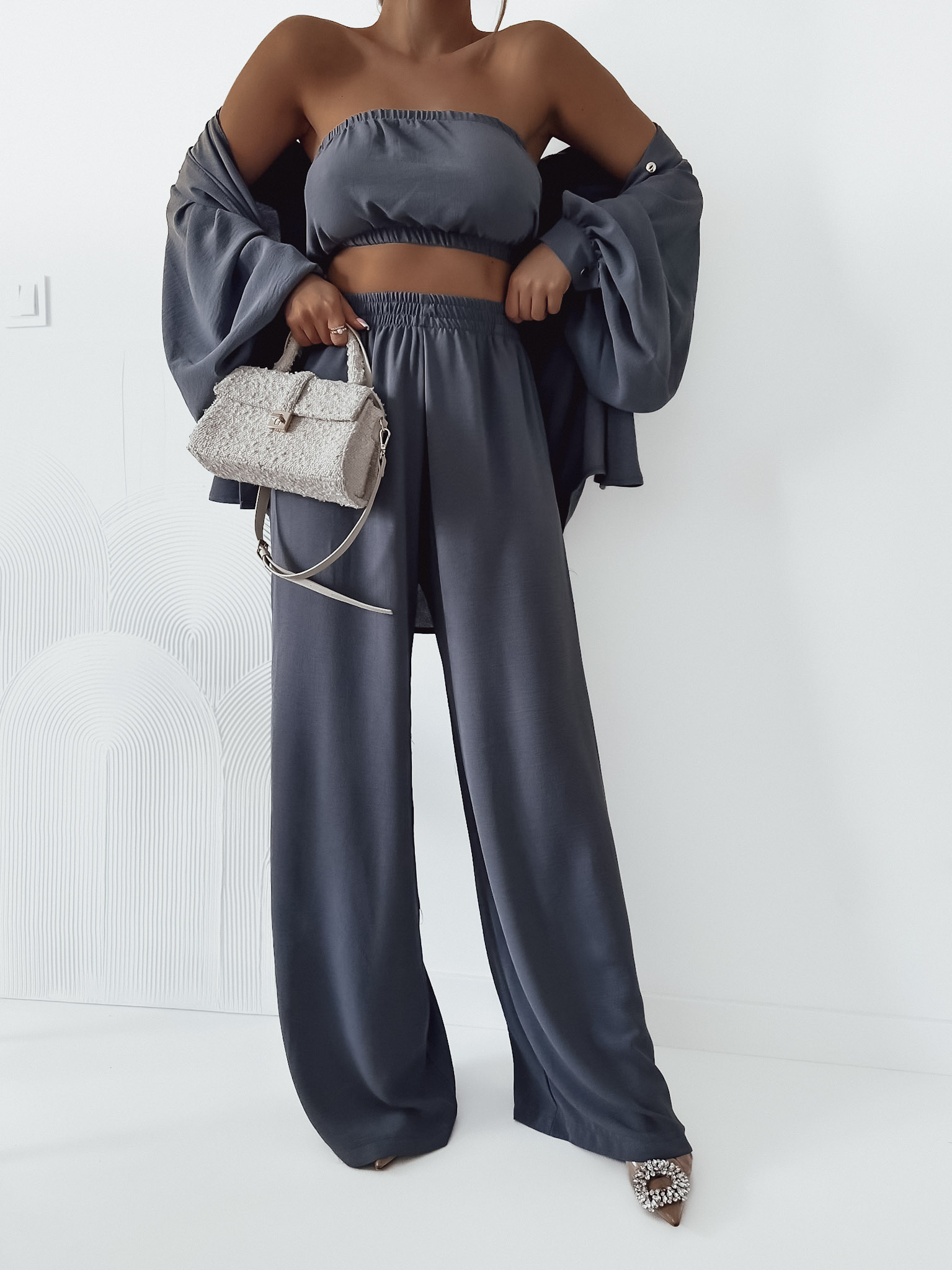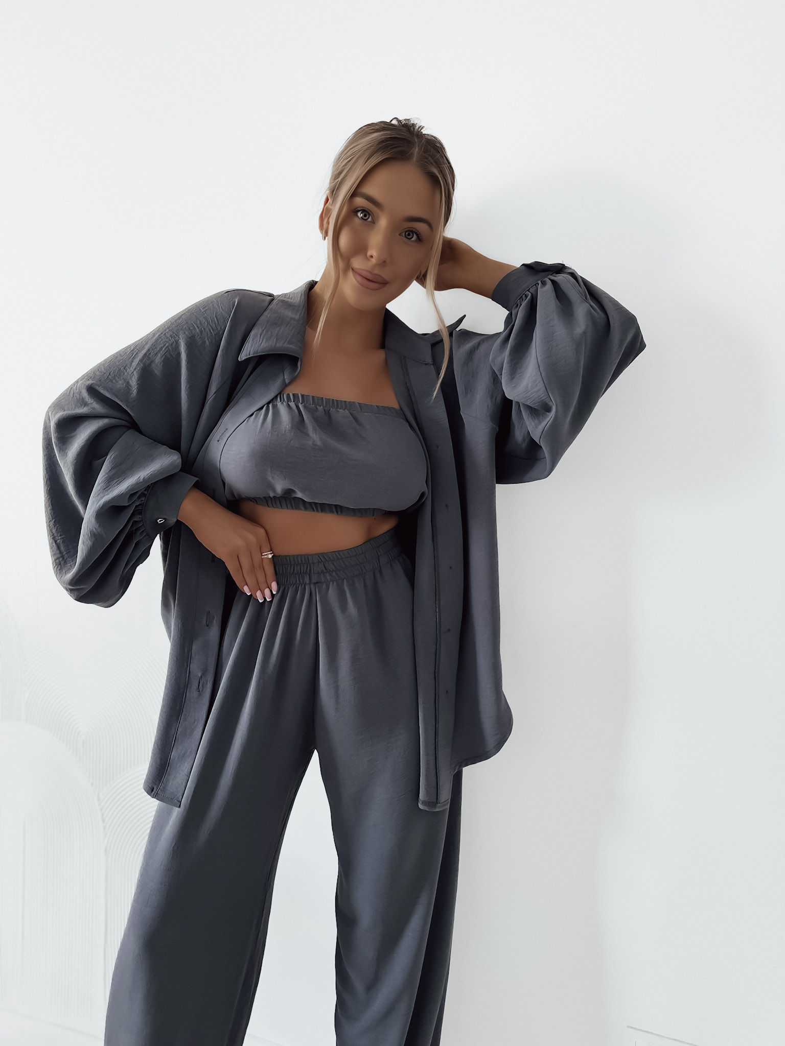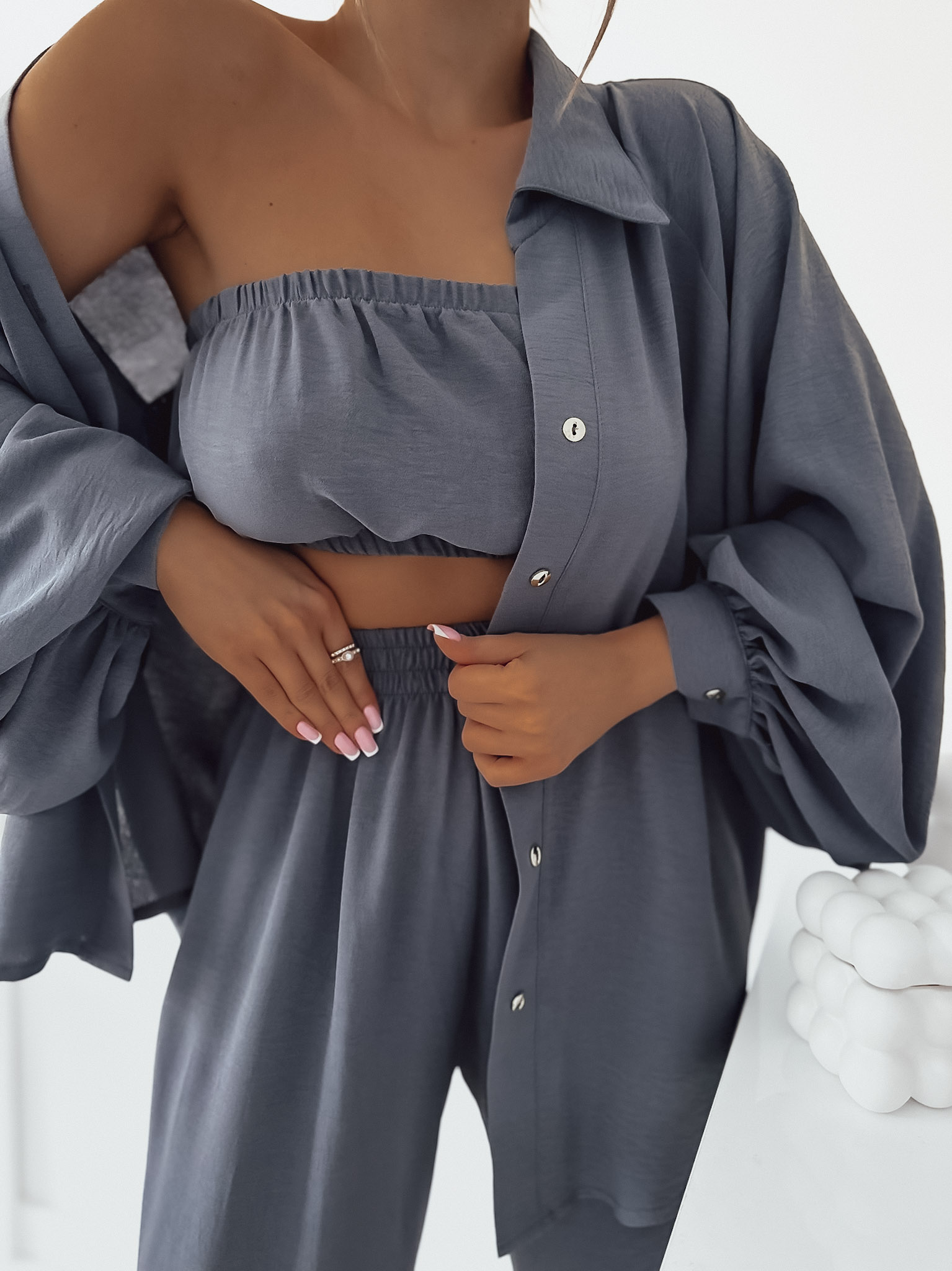 Delikatna, zwiewny komplet 3-częściowy(top, koszula i spodnie). Luźny krój. Polska produkcja.