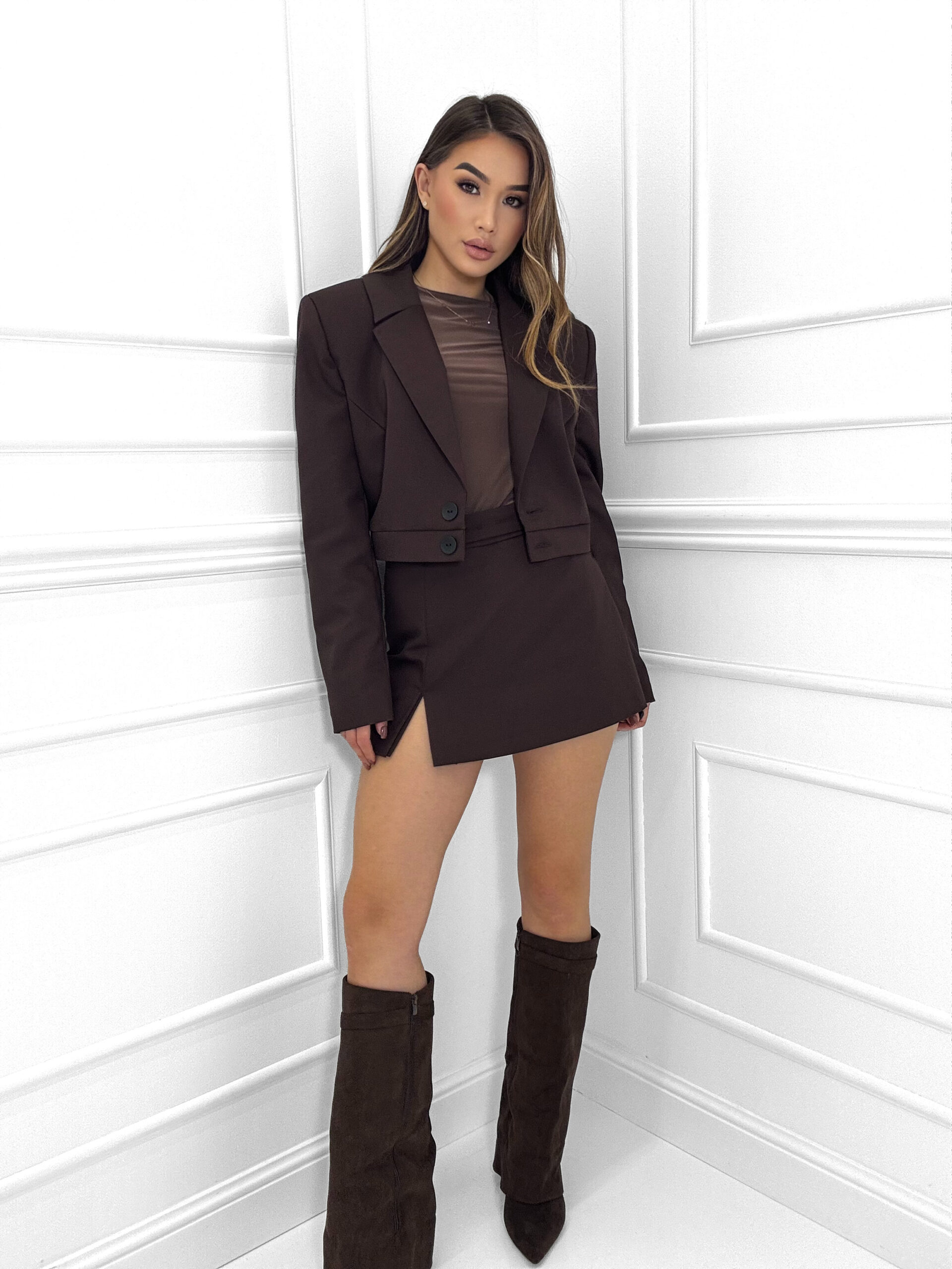 Krótka marynarka o nowoczesnym kroju, która podkreśla talie i dodaje pewności siebie. Idealnie komponuje się z naszymi spódnico – spodenkami. Dopracowane detale, guziki przy mankietach, podszewka i perfekcyjne wykończenie – sprawią, ze ta marynarka stanie się Twoim ulubionym elementem każdej stylizacji. Polski produkt.