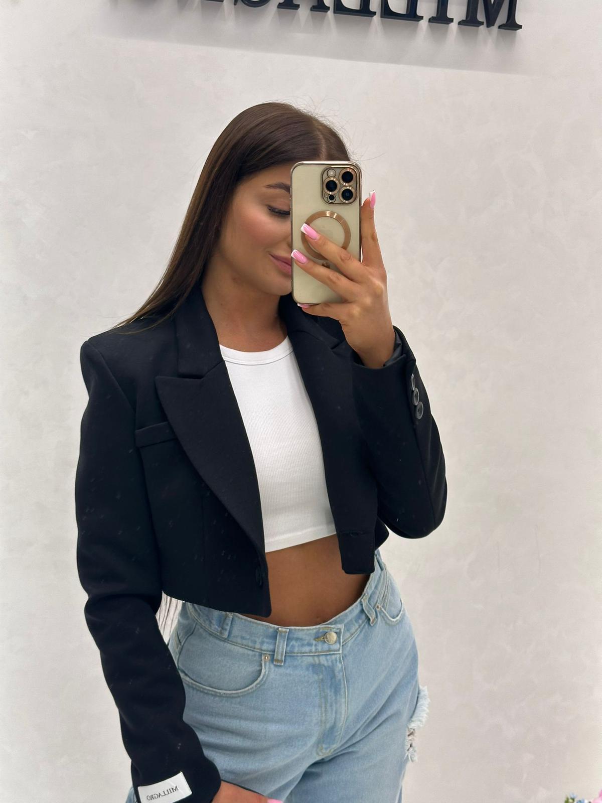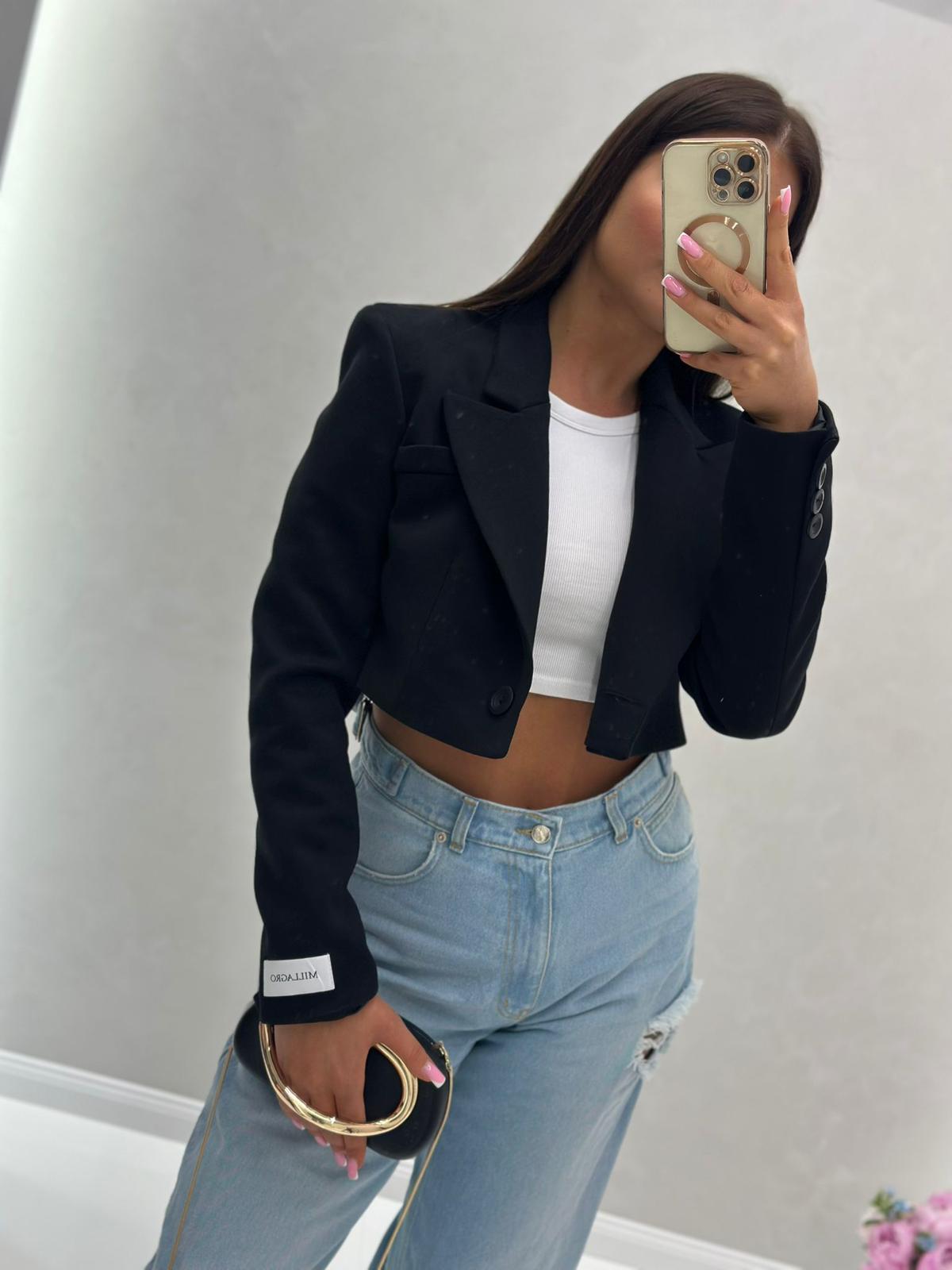 Marynarka wykonana z dresowej tkaniny przyjemnej w dotyku z dwoma kieszeniami. Marynarkę można łączyć ze spodniami typu dzwony z tego samego materiału. Polska produkcja.