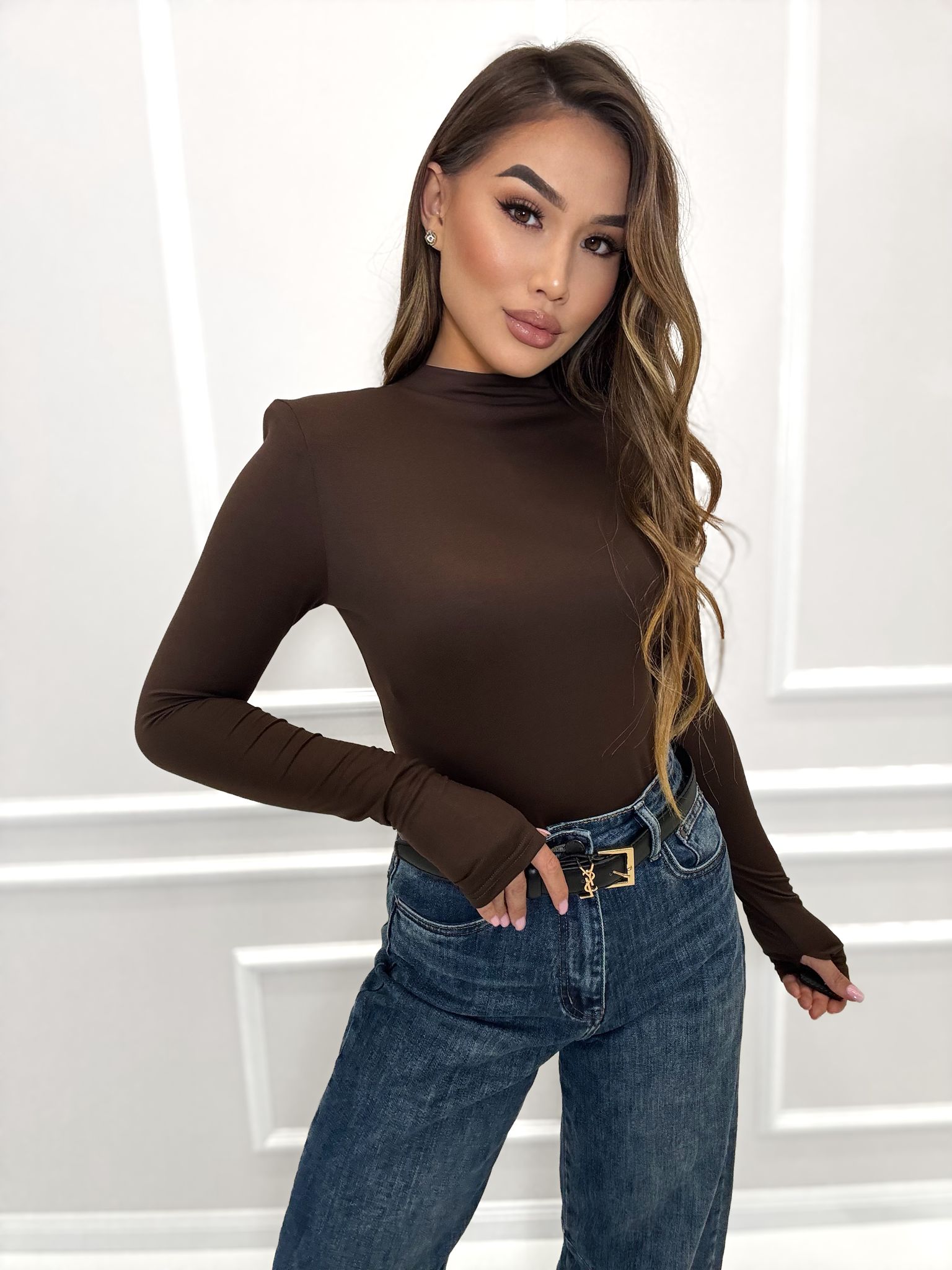 Gładki pół golfik z rękawem na paluszek w przepięknych jesiennych kolorach, bluzka wykonana z wysokiej jakości tkaniny De Lux przyjemnej w dotyku. Polska produkcja.
