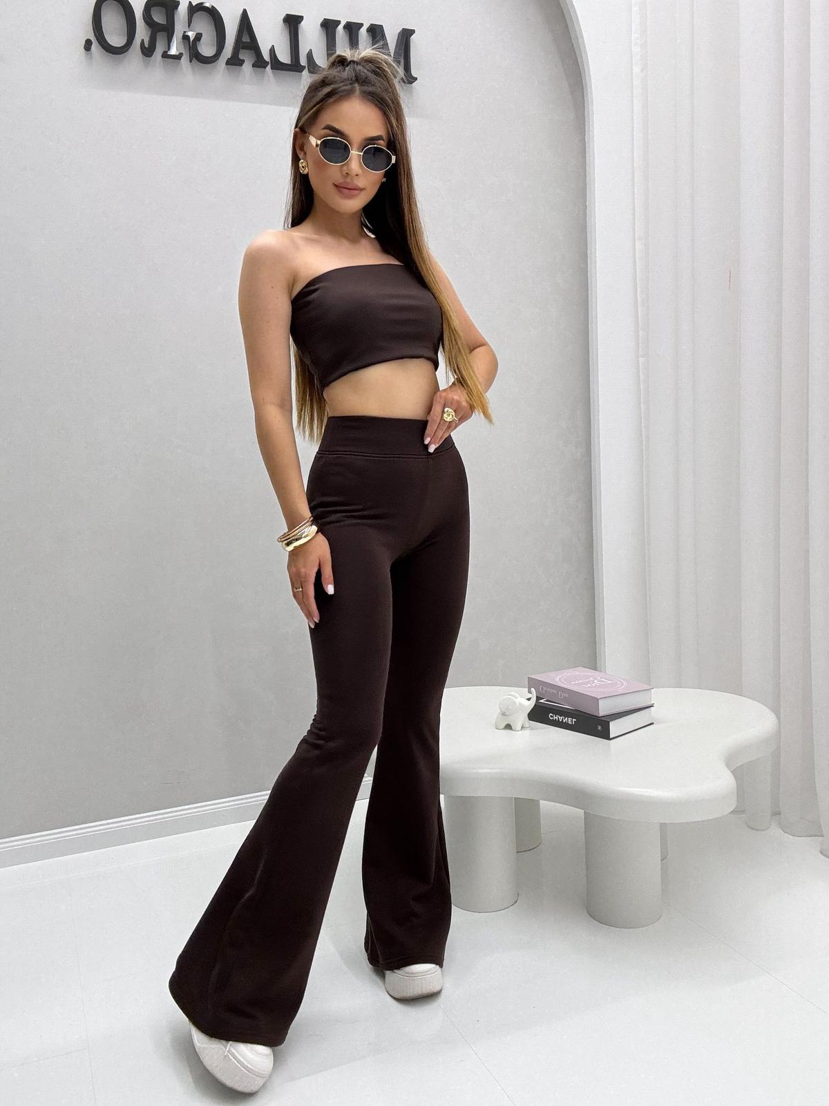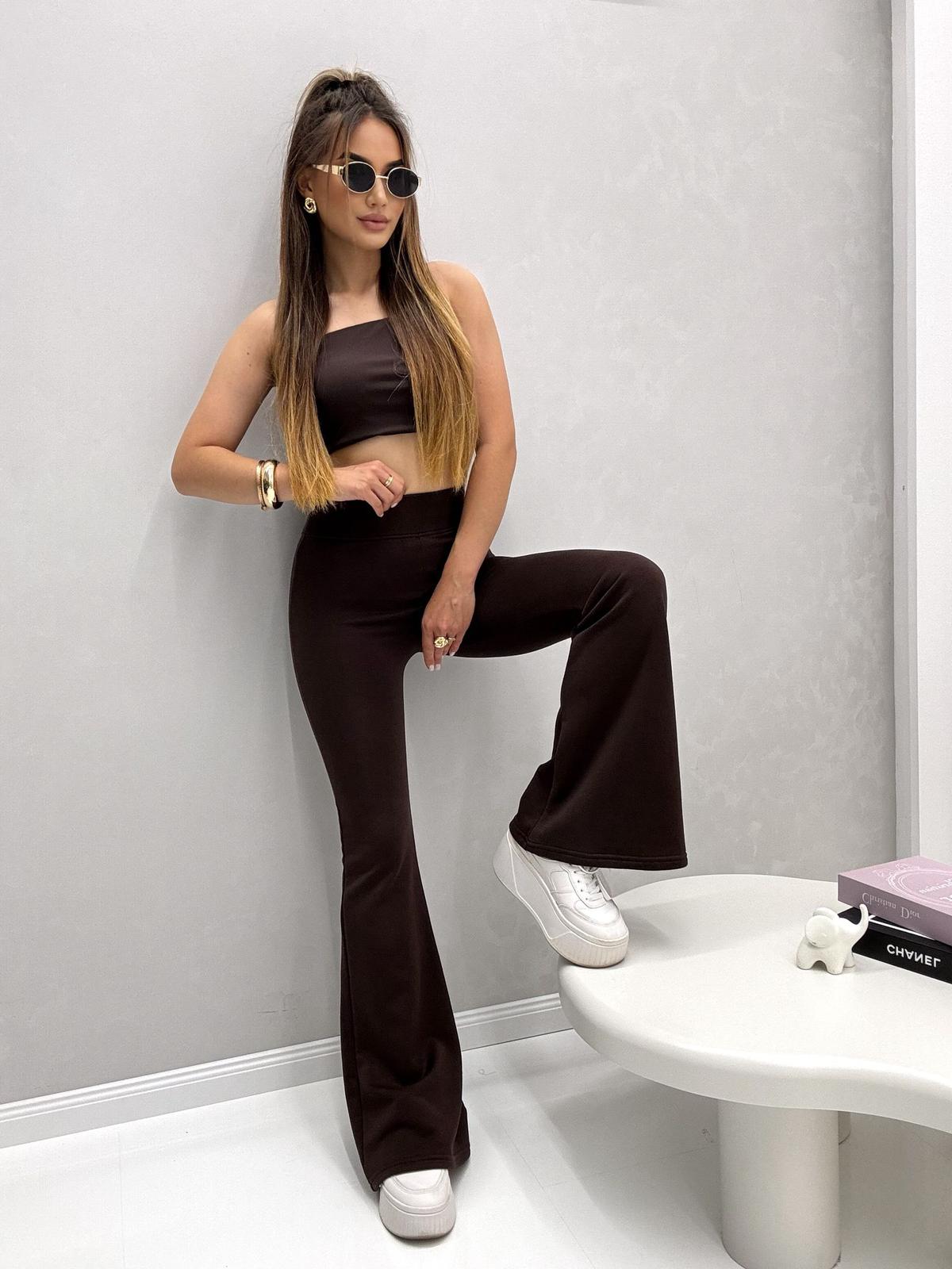 Spodnie typu dzwony wykonane z dresowej tkaniny przyjemnej w dotyku w pasie szeroka guma. Spodnie pięknie podkreślają talię, można łączyć z marynarką z tego samego materiału. Polska produkcja.