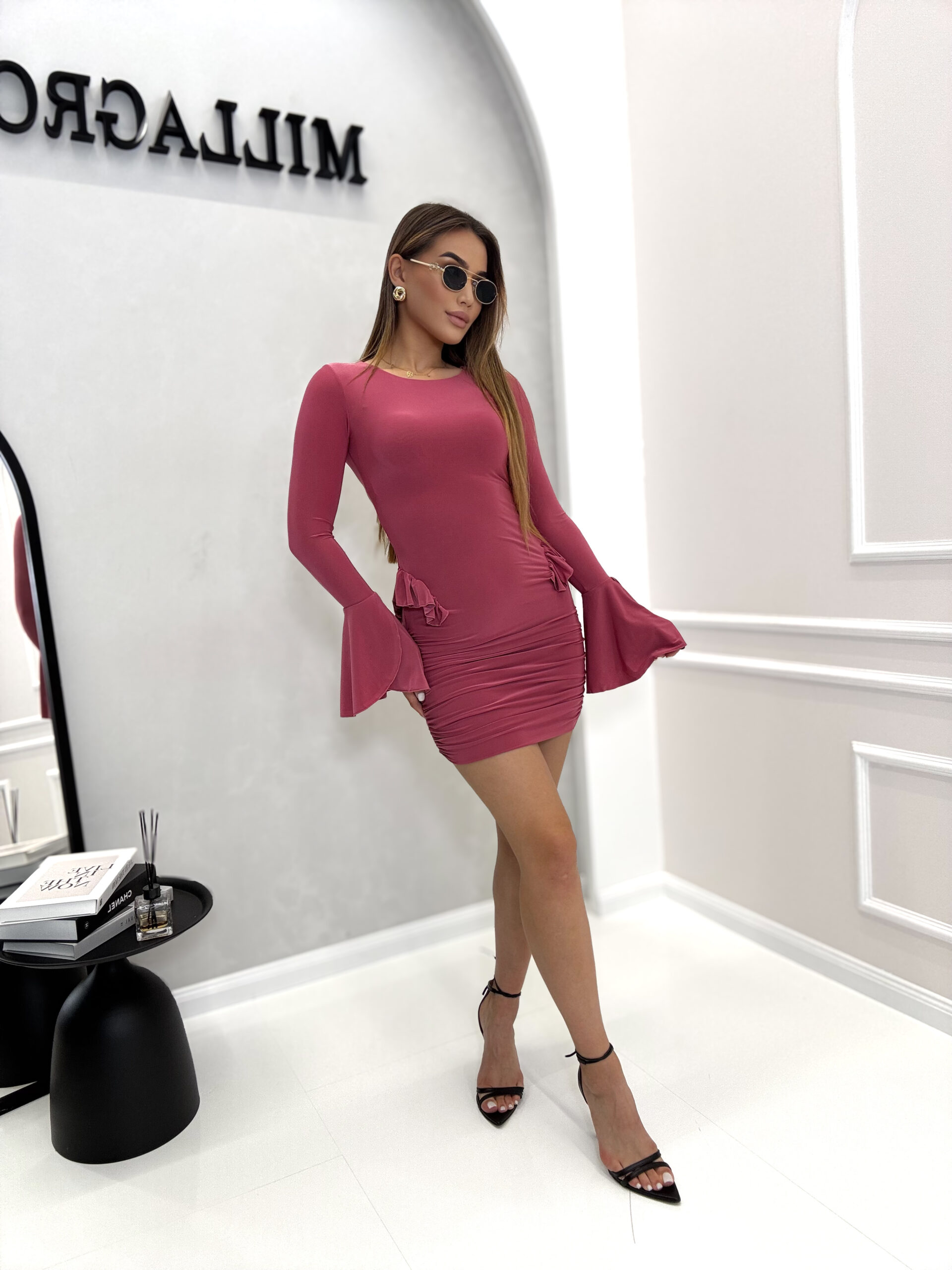 Sukienka MIRELLE mini z falbanką to połączenie kobiecej elegancji. Dopasowany krój pięknie podkreśla sylwetkę, a falbanki przy biodrach i szerokie rękawy nadają jej wyjątkowego charakteru. Wykonana z elastycznego, miękkiego materiału, idealnie dopasowuje się do ciała, zapewniając komfort i pewność siebie na każdą okazje. Polska produkcja.