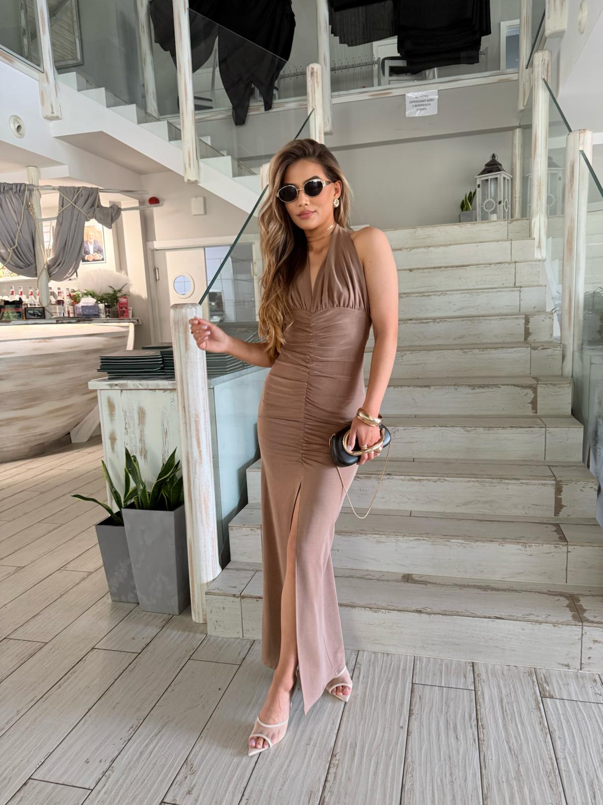 Sukienka wiązana na szyi z marszczeniem i rozcięciem wykonana z delikatnej i wysokiej jakości tkaniny De Lux, sukienka pięknie podkreśla talie. Polska produkcja.