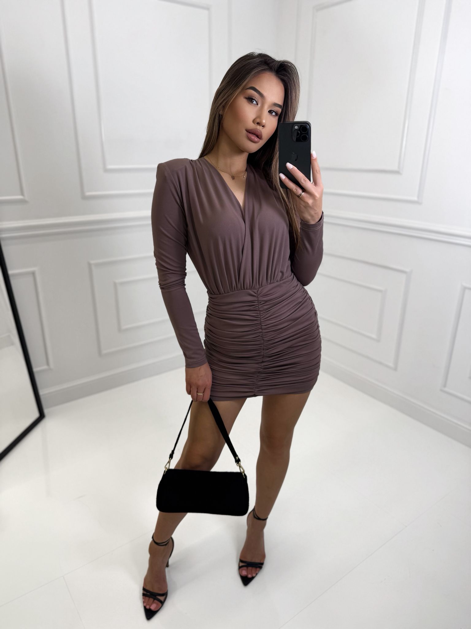 Sukienka z dekoltem i marszczeniami pięknie podkreślająca figurę, wykonana z delikatnej i wysokiej jakości tkaniny De Lux. Polska produkcja.