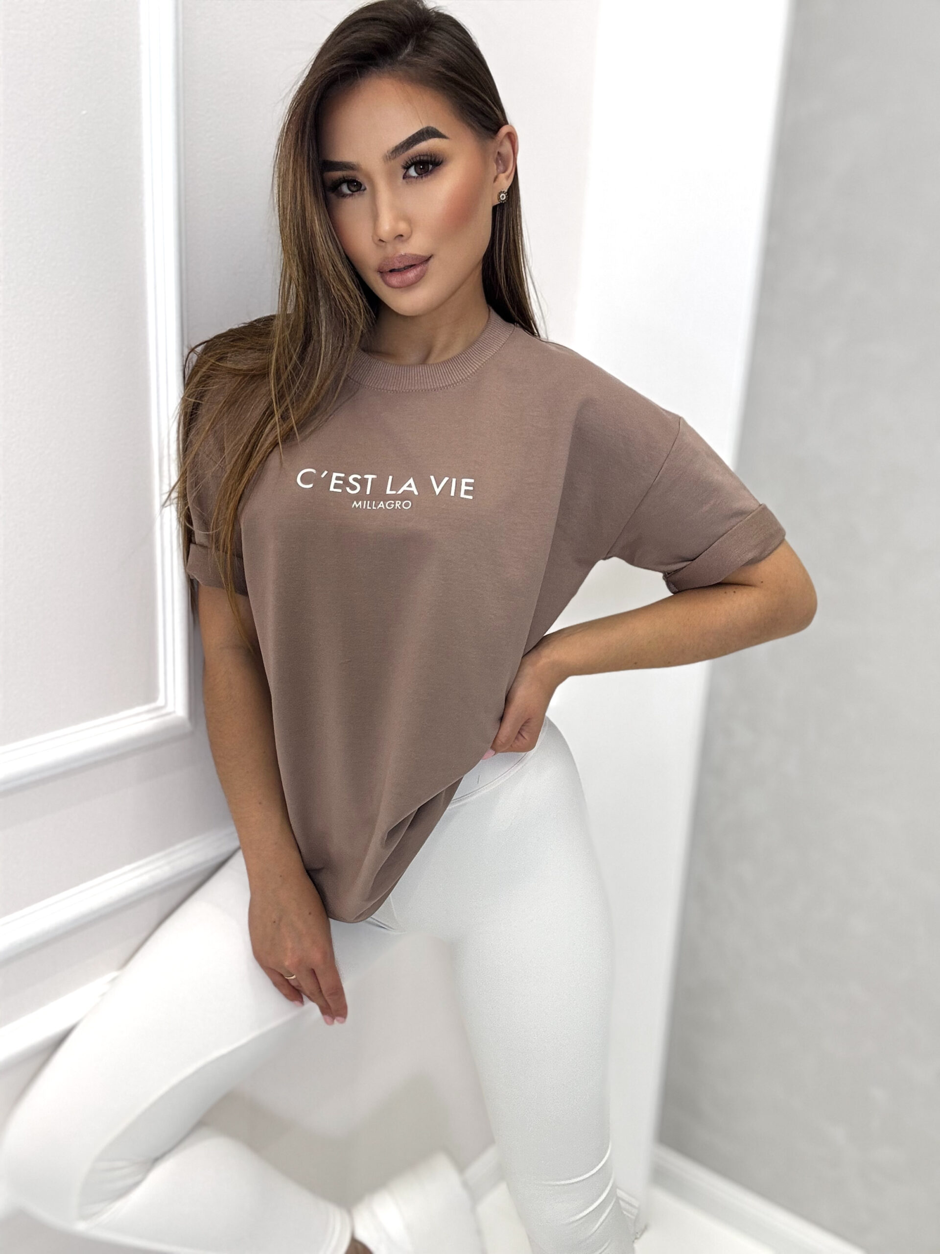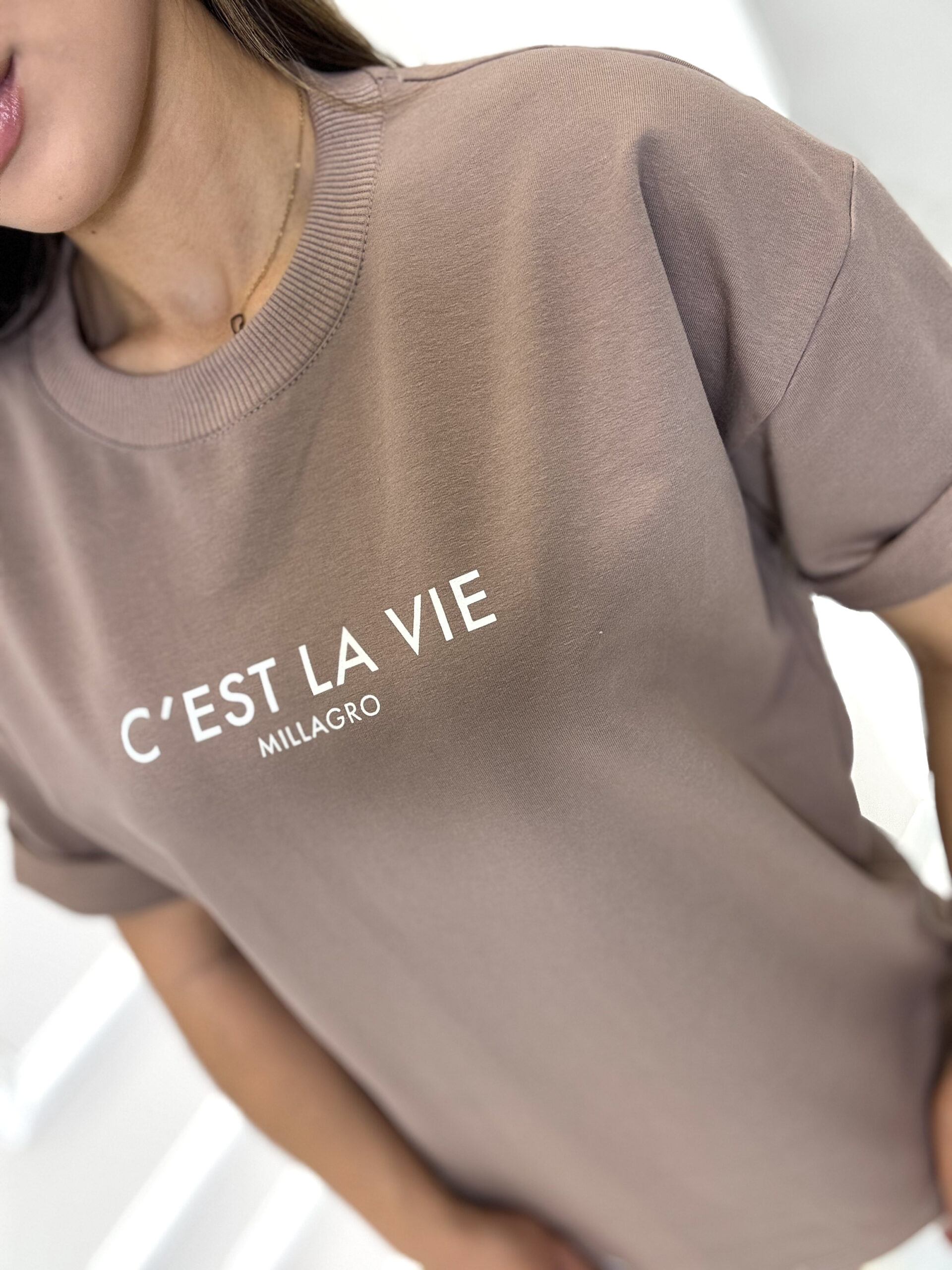T-shirt C’EST LA VIE by MILLAGRO to idealne połączenie wygody i stylu. Wykonany z miękkiej, oddychającej bawełny, zapewnia komfort przez cały dzień. Dzięki klasycznemu krojowi oversize świetnie wygląda zarówno w casualowych, jak i bardziej stylowych zestawach – z jeansami, spódnicą czy legginsami. Polska produkcja.